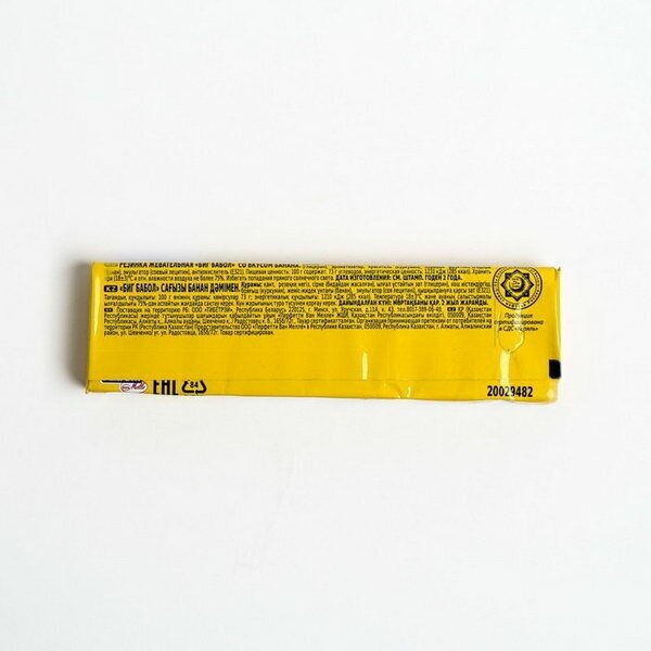 | Состав | сахар, основа резиновая, патока (из пшеницы), агент влагоудерживающий (глицерин), ароматизатор, краситель (куркумин), порошок фруктово-ягодный (банан), эмульгатор (соевый лецитин), антиокислитель (Е321) |