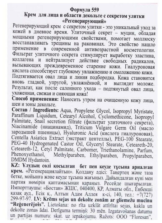 Регенерирующий крем с секретом улитки - это уникальный уход за кожей в дневное время. Улиточный секрет – муцин, обладая мощными регенерирующими свойствами, помогает моллюску восстанавливать трещины на раковинах. Это свойство нашло применение в современной антивозрастной косметологии. Фильтрат улиточного секрета стимулирует выработку эластина, коллагена и нейтрализует действие свободных радикалов, вызывающих преждевременное старение кожи. Гиалуроновая кислота способствует глубокому увлажнению и омоложению кожи. Подтягивается овал лица и линия подбородка. Кожа становится вновь гладкой, упругой, увлажнённой, и выглядит моложе. Результат, как после салонного ухода – подтянутый овал лица, ухоженная, свежая и сияющая кожа! Способ применения: Наносить утром на очищенную кожу лица, шеи и зоны декольте