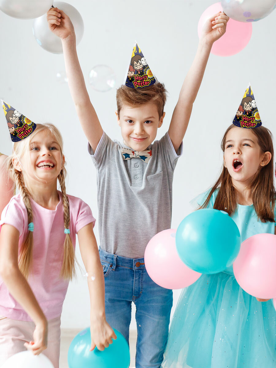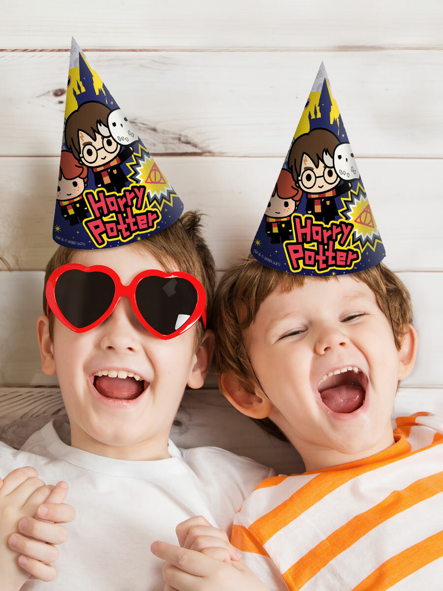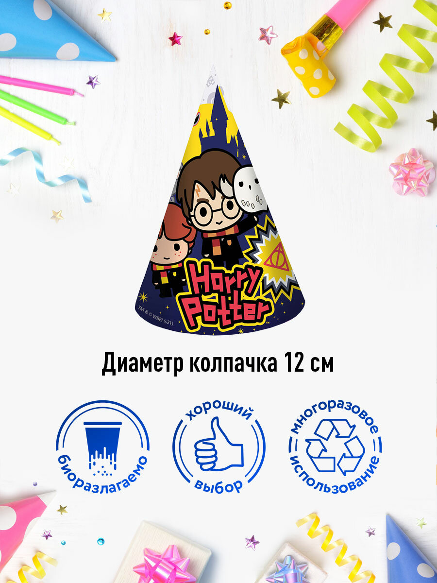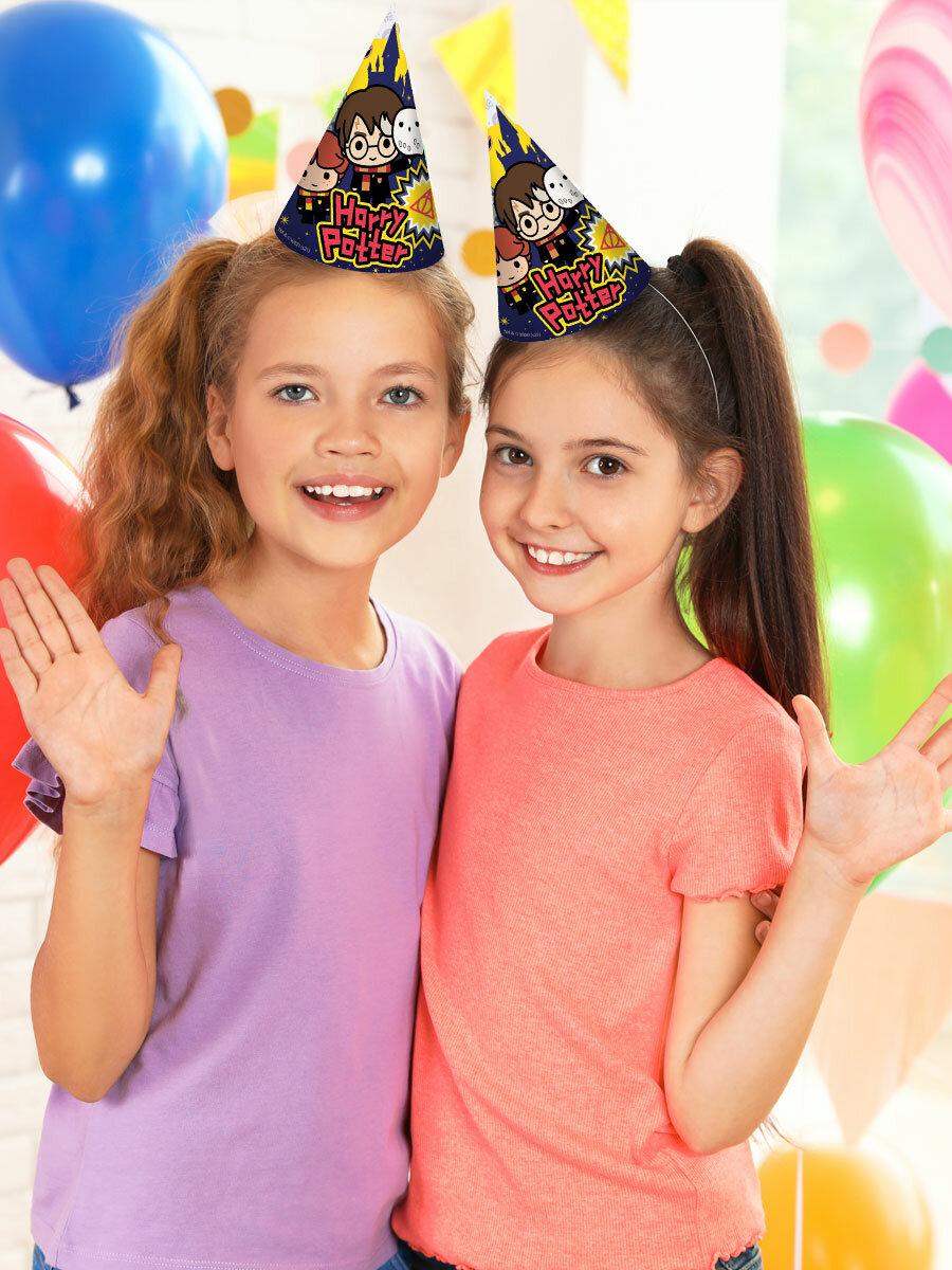 Устройте вечеринку юных волшебников с Гарри Поттером, окунувшись в волшебную атмосферу Хогвартса и его тайн. Изучайте новые заклинания, варите зелья, играйте в квиддич, ищите Тайную комнату, участвуйте в Турнире Трёх Волшебников, и опасайтесь сами знаете Кого! В упаковке 6 бумажных колпачков на резиночках.