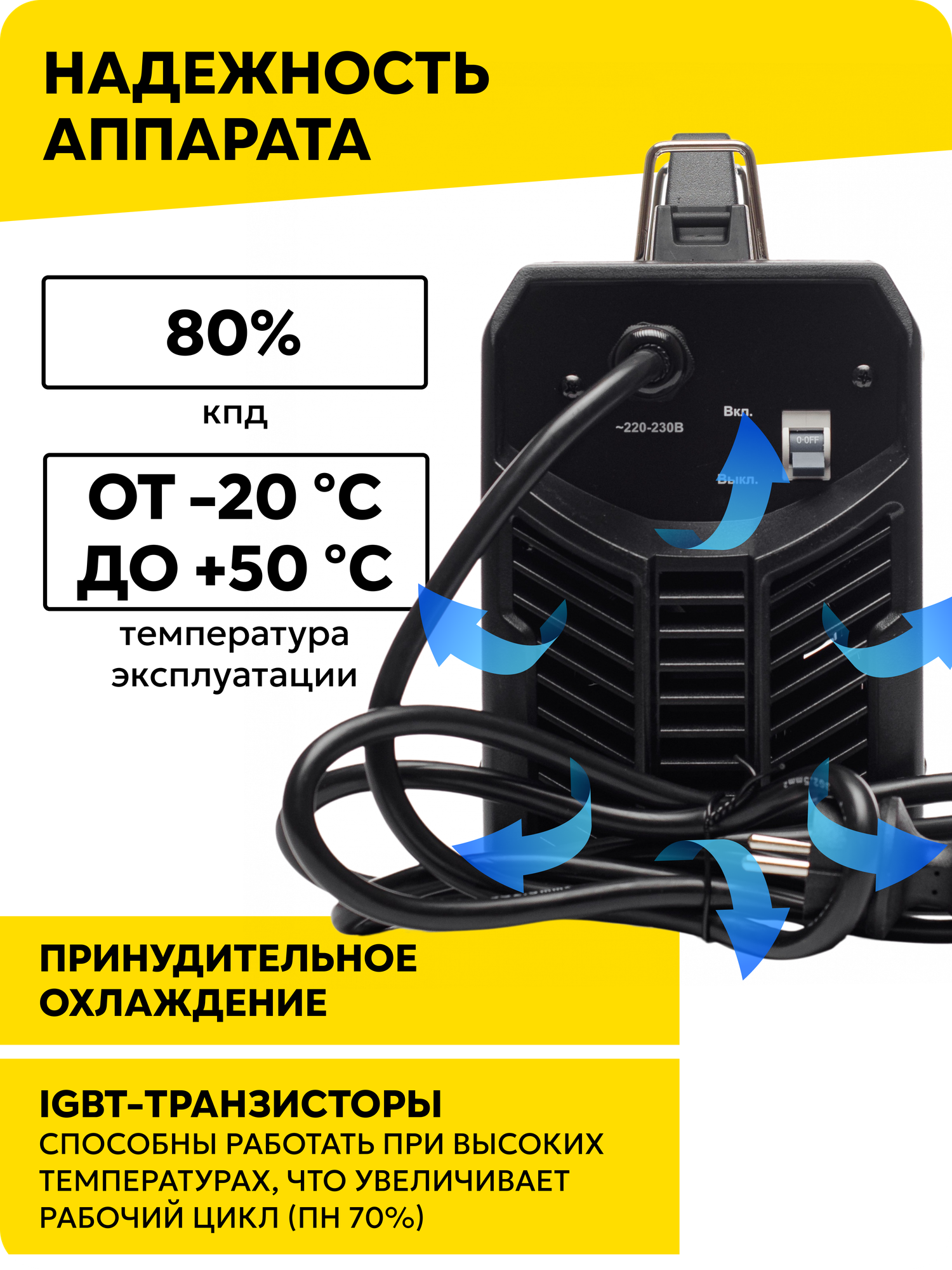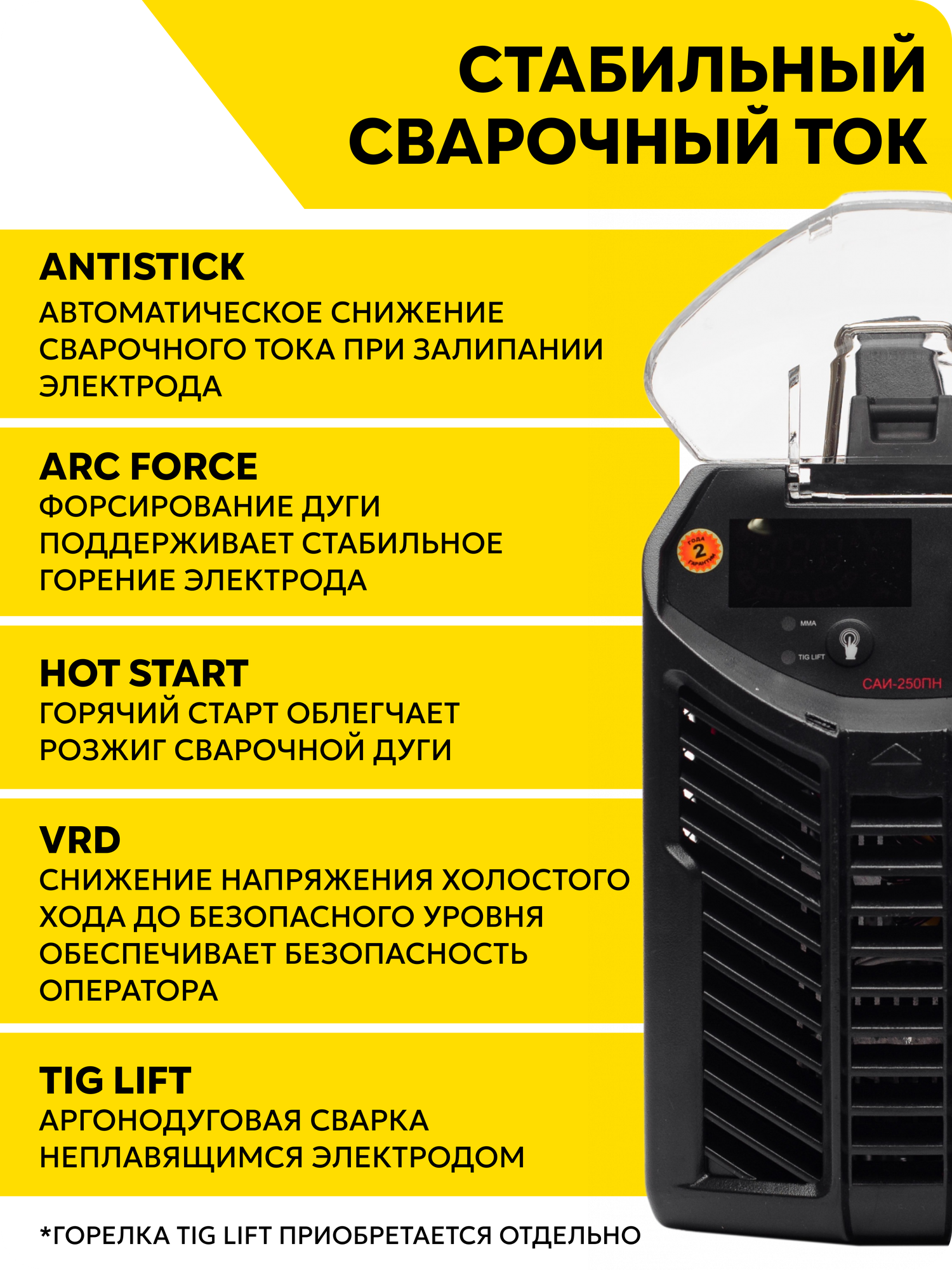| Особенности | Диапазон рабочих температур: - 10°С до + 40°С Дисплей с индикацией силы тока Плавная регулировка силы тока Функция Arc Force - регулируемый форсаж дуги Длина кабеля питания - 1,9 м Длина кабеля с электродержателем - 3 м Класс защиты - IP21 Функция HOT START |