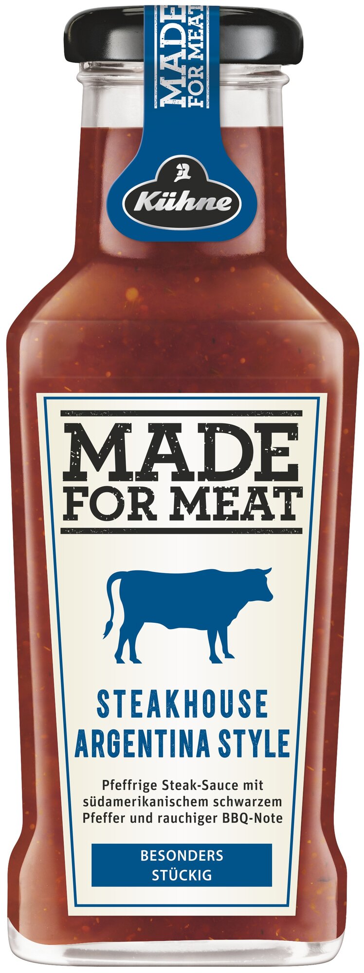 Сочный стейк Black Angus. Не лучше ли? Новый стейк-хаус Made For Meat Argentina Style ставит еще один на вершине. Южноамериканский черный перец добавляет свой пикантный вкус к фруктовому красному соусу, дымная нотка барбекю приносит настоящую аргентинскую кнопку стейк-хауса на тарелку для гриля. Высокое удовольствие запрограммировано!