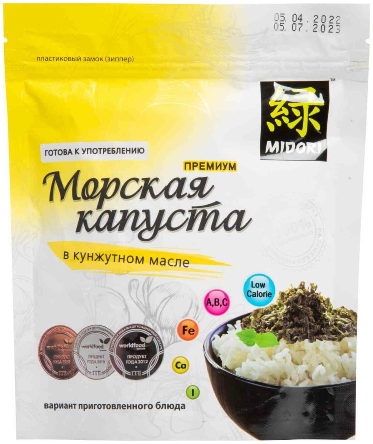 Обжаренная в кунжутном масле, готовая к употреблению. Высококачественная морская капуста, обжаренная в кунжутном масле, произведена в Ю. Корее, выращена в чистых водах Тихого океана. Морская капуста содержит витамины А, С и важные микроэлементы: йод, железо, кальцый. Благоприятно воздействует в целом на здоровье человека. Особенно полезно для щетовидной железы.