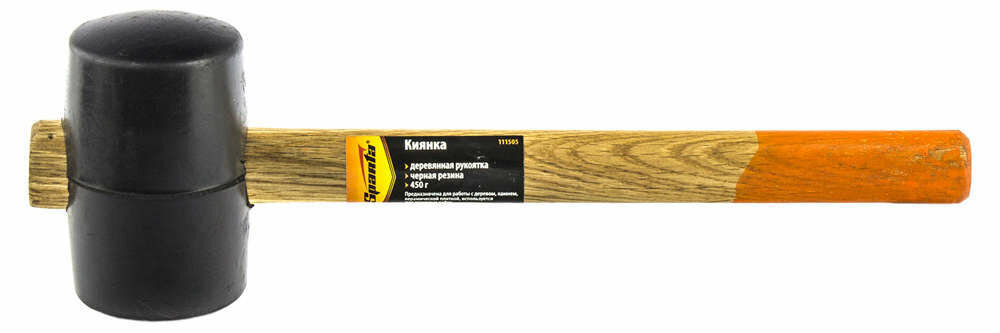 Киянка с головкой из черной резины твердостью 80 единиц по Шору А. От традиционной конструкции инструмент отличается креплением бойка «на протяг». Двухцветная рукоятка, изготовленная из древесины, защищена от рассыхания бесцветным лаком.