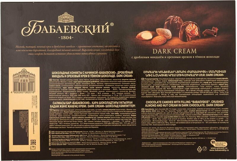 | Состав | темный шоколад (сахар, какао тертое, масло какао, жир молочный, эмульгатор лецитин соевый, ароматизатор "ваниль"), сахар, ядро ореха миндаля дробленое, заменитель молочного жира (рафинированные дезодорированные растительные масла |