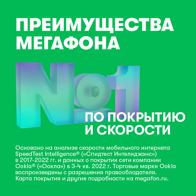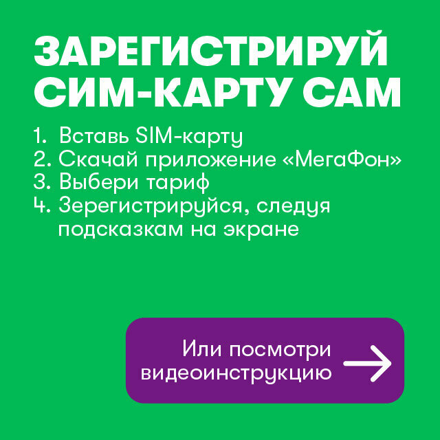 Зарегистрируйте SIM-карту самостоятельно в любое время и в любом месте с помощью приложения Мегафон, следуя подсказкам на экране. Подробная инструкция по активации SIM-карты на сайте www. megafon. ru/go/abonent_id/300 рублей будут зачислены на баланс SIM-карты сразу после активации - это отличный старт для общения! Новый номер будет указан на упаковке.Для дистанционного заключения договора потребуется: подтвержденный аккаунт на Госуслугах и смартфон.Выбор тарифного плана доступен при регистрации в приложении МегаФон (6+). При активации тарифа линейки Безпереплат в подарок и навсегда 50 каналов Мегафон ТВ.SIM-карта подходит для всех устройств (смартчасы, смартфон, планшет, модем, роутер, умный дом, сигнализация и т. п.)Тарифы действуют по всей России. На территории Республики Крым и г. Севастополь услуги связи оплачиваются на особых условиях.