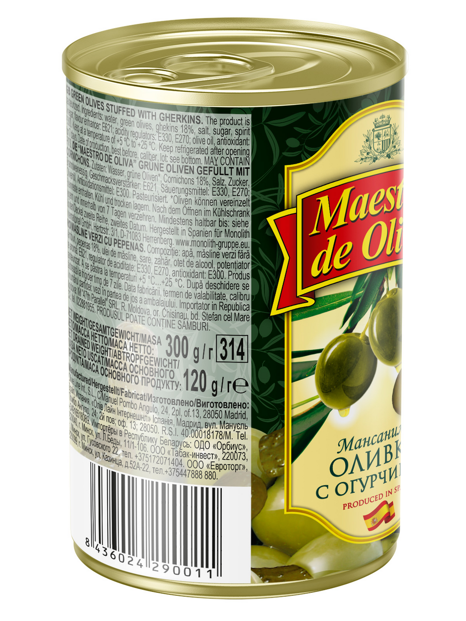 Оливки зеленые Maestro de Oliva на огурчике в оливковом масле 300 г
