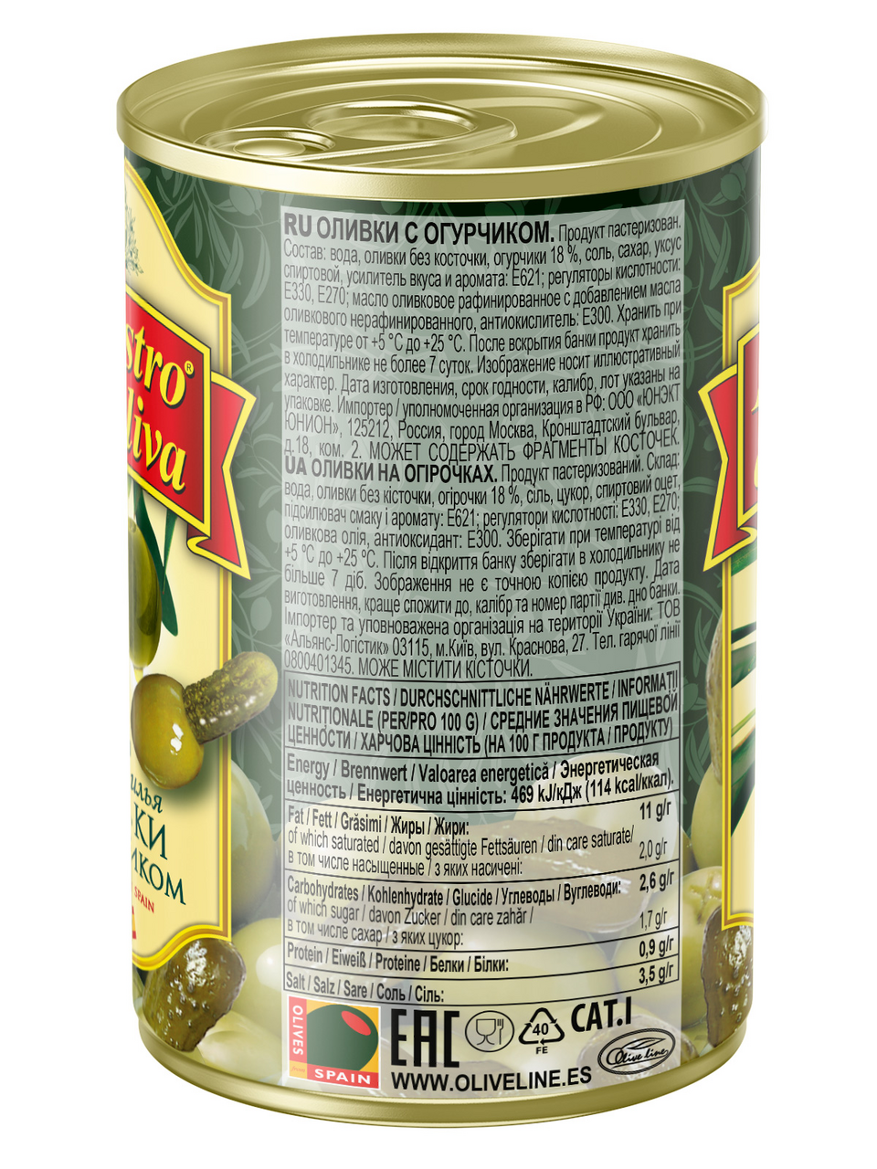 | Состав | оливки без косточки, огурчики, вода, оливковое масло, соль, усилитель вкуса и аромата |