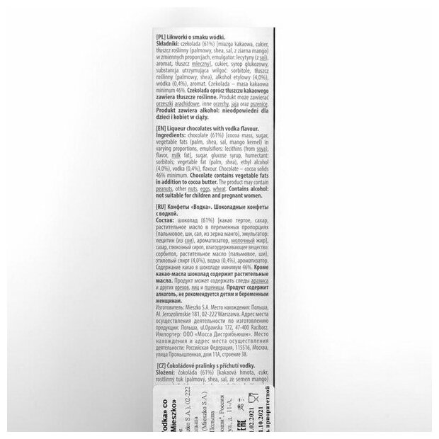 | Состав | Шоколад 61% (целлюлоза какао, сахар, растительный жир (пальмовое, ши, сал, из зерна манго) в переменных пропорциях, эмульгатор лецитин из сои, ароматизатор, жир молочный), сахар, глюкозный сироп, вещество, удерживающее влагу sorbitol, растительный жир (пальмовое, ши), спирт этиловый 4%, водка 0,4%, ароматизатор. |