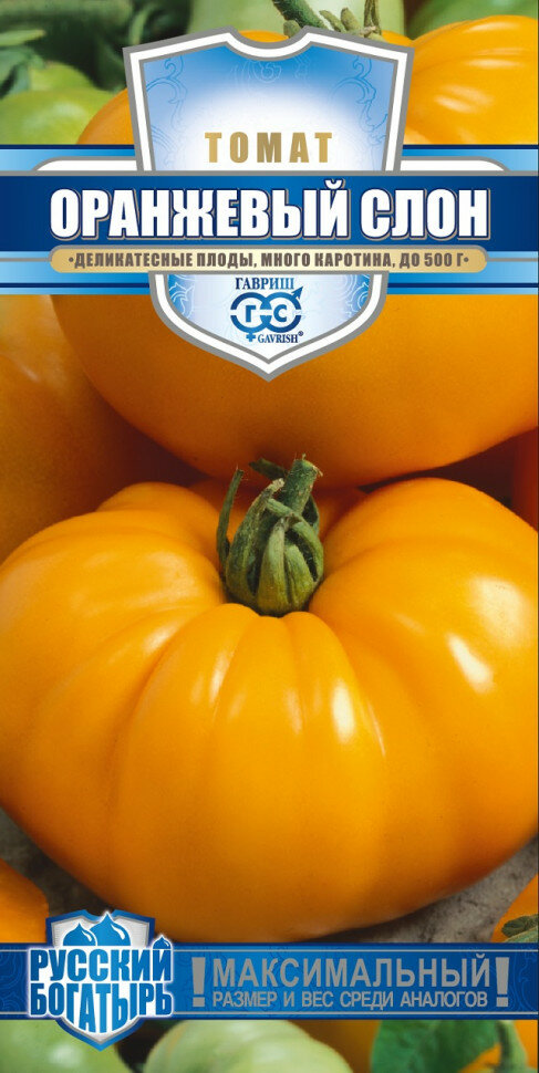 Томат оранжевый слон неприхотлив, способен приживаться в разных климатических условиях и дает большой полезный урожай. Сорт среднеспелый (110–120 дней от всходов до плодоношения), для выращивания в пленочных теплицах и открытом грунте (в южных регионах) с подвязкой к кольям. Растение детерминантное (с ограниченным ростом), высотой 70–100 см. Плоды плоскоокруглые, ярко-оранжевые, средней массой 250–300 г (отдельные до 500 г!). Мякоть нежная, с приятным сладковатым вкусом, содержит много каротина. Используют для приготовления свежих летних салатов, соков и томатных соусов. В сочетании с другими сортами крупноплодных томатов получаются очень яркие и вкусные овощные нарезки. Посев на рассаду — в конце марта–начале апреля. Пикировка — в фазе первого настоящего листа. Высадка в грунт — в конце мая–начале июня. Подвязка, регулярные подкормки, сбор плодов в бланжевой спелости с последующим дозариванием увеличивает выход урожая. Семена после уборки сохраняют всхожесть в течение 10 лет при оптимальных условиях хранения. Рекомендуется увеличить норму высева по истечение срока годности.