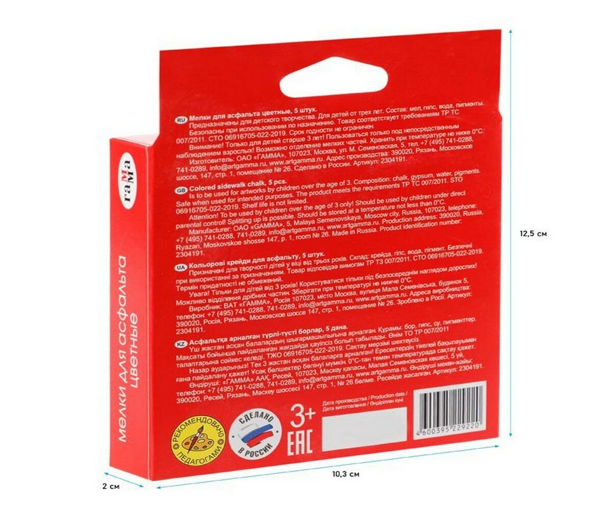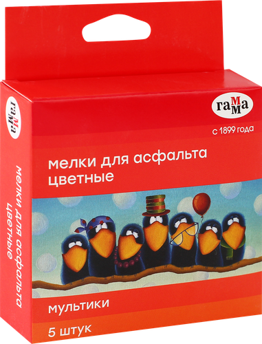 Асфальтовый мел "Мультики" выпускается в двух типоразмерах: круглый и квадратный, фасуется в картонные коробки и пластиковые ведерки. Мел изготовлен на основе натуральных компонентов и соответствует всем требованиям безопасности. Мелки отличаются высокой укрывающей способностью, не крошатся, легко стираются с рук и не царапают поверхность. Яркая цветовая палитра асфальтовых мелков ГАММА помогает создавать оригинальные красочные рисунки.