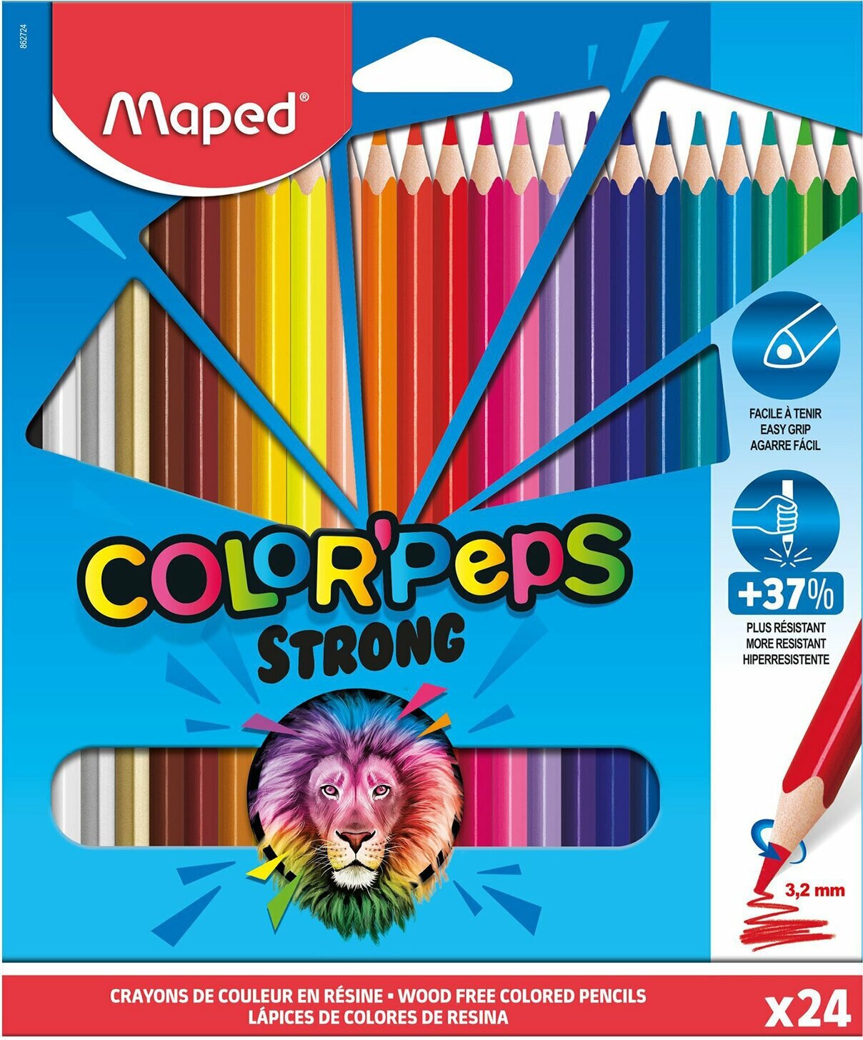 Цветные карандаши повышенной прочности имеют эргономичную треугольную форму, позволяющую удобно располагать их в руке. Карандаши на 37% прочнее карандашей COLOR'PEPS. Корпусы карандашей изготовлены из пластика. Грифель ударопрочный, и при этом хорошо точится. В упаковке: 24 цветных карандаша. Длина: 208 мм. Форма корпуса: трехгранная. Диаметр грифеля: 3,2 мм.