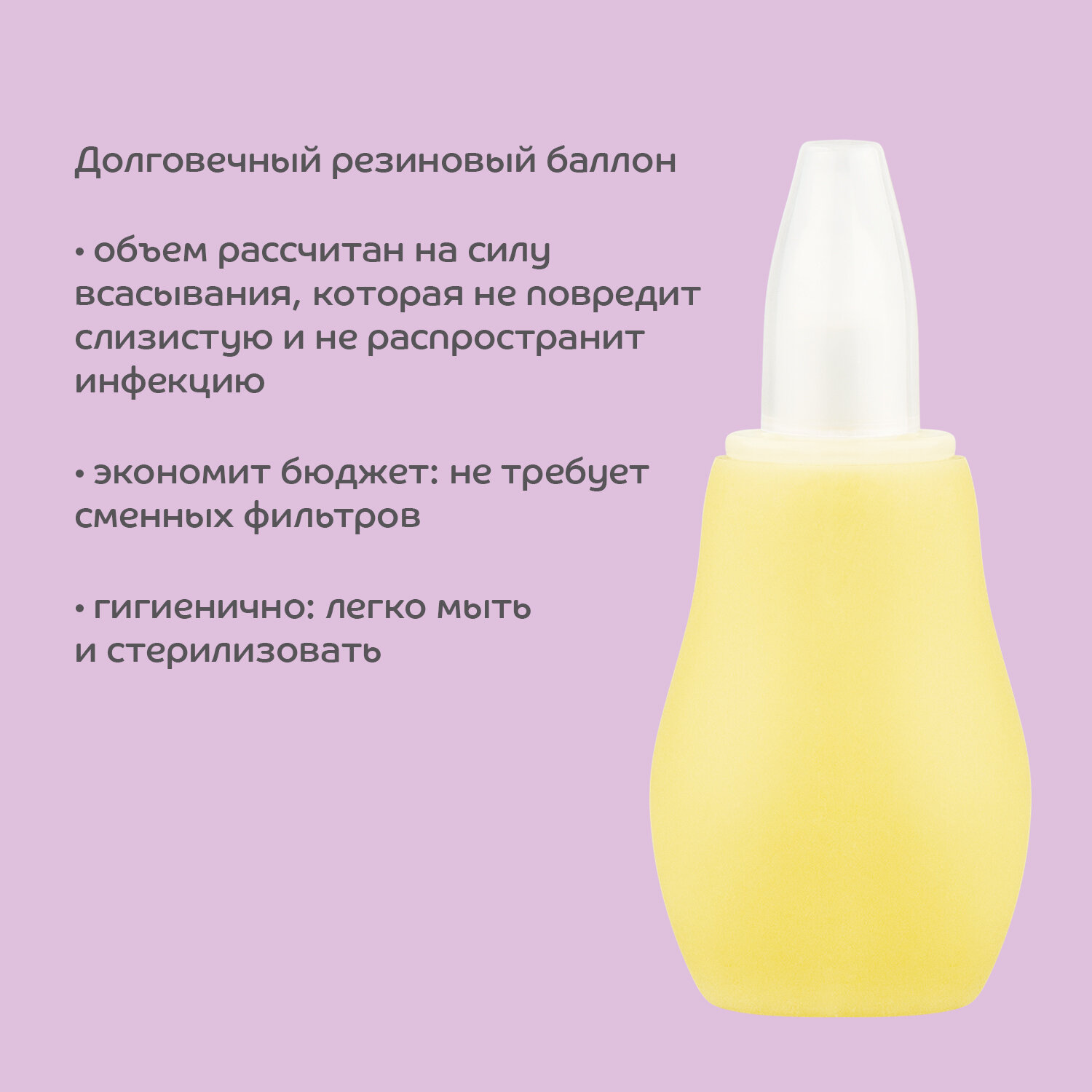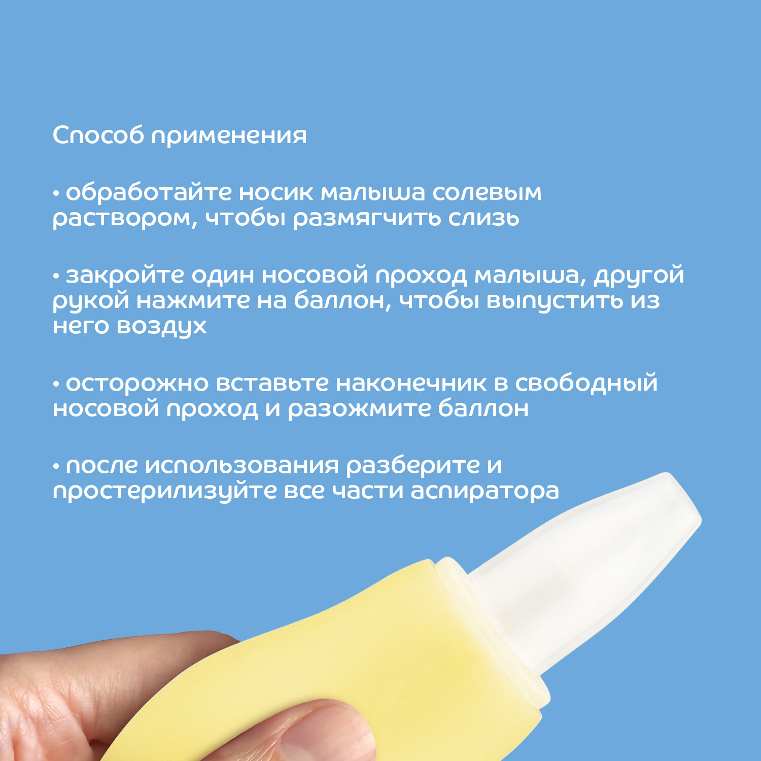 Аспиратор помогает очистить нос ребенка от слизистых выделений и облегчить дыхание. Прост в использовании и может применяться с самого рождения. Расширенное основание кончика аспиратора препятствует глубокому проникновению. Мягкий силиконовый кончик, поможет безболезненно удалить слизь из носика ребенка. Не требует сменных фильтров.