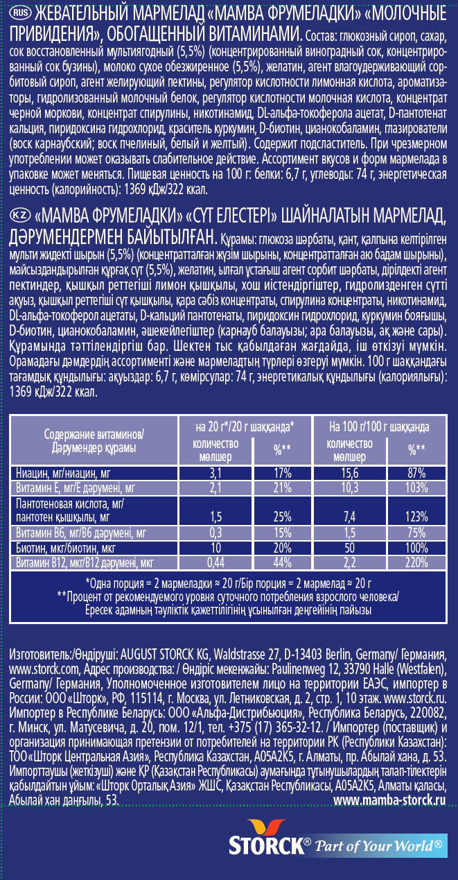 | Состав | Глюкозный сироп, сахар, сок восстановленный мультиягодный (5,5%) (концентрированный виноградный сок, концентрированный сок бузины), молоко сухое обезжиренное (5,5%), желатин, агент влагоудерживающий сорбитовый сироп, агент желирующий пектины, регулятор кислотности лимонная кислота, ароматизаторы, гидролизованный молочный белок, регулятор кислотности молочная кислота, концентрат черной моркови, концентрат спирулины, никотинамид, DL-альфа-токоферола ацетат, D-пантотенат кальция, пиридоксина гидрохлорид, краситель куркумин, D-биотин, цианокобаламин, глазирователи (воск карнаубский; воск пчелиный, белый и желтый). |