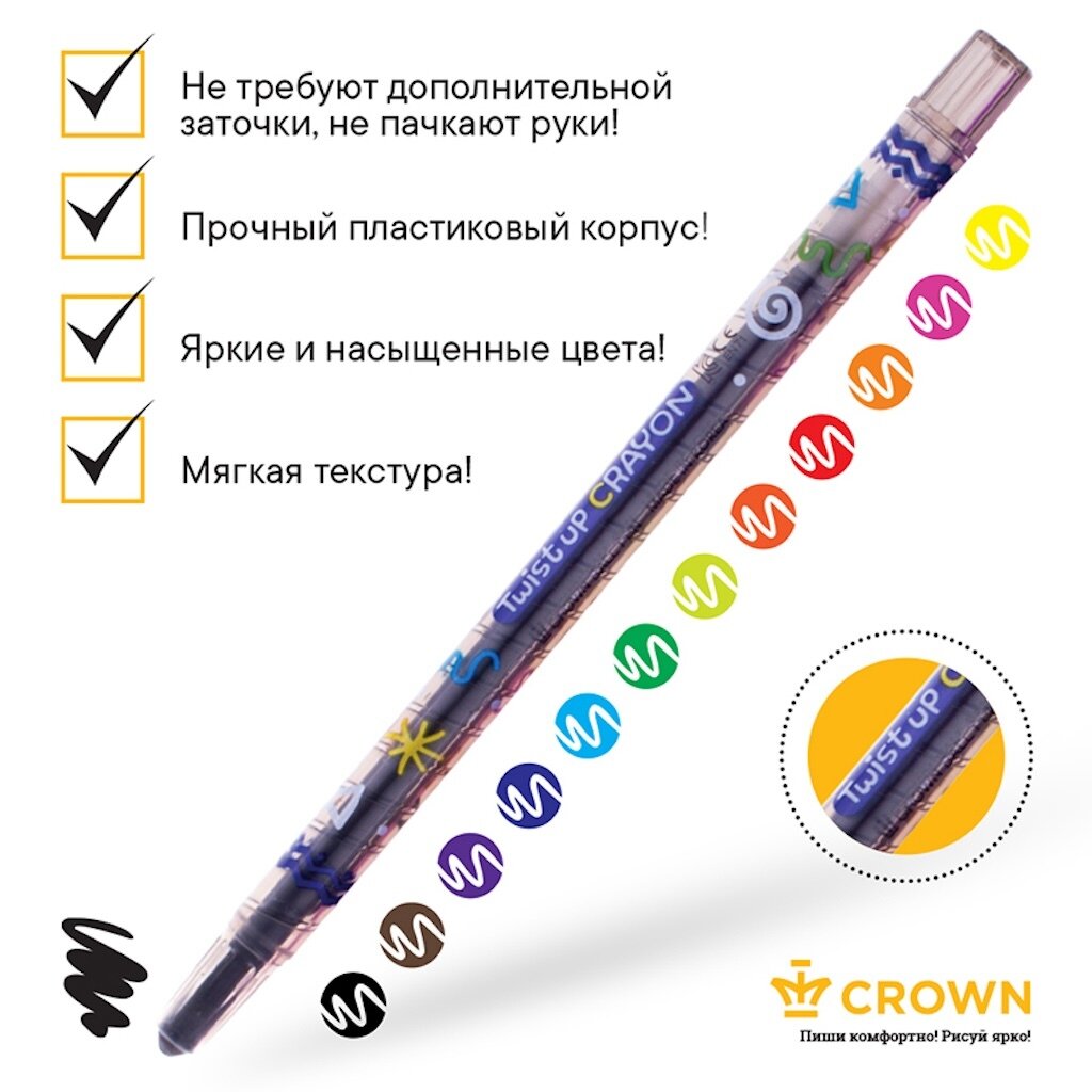 Набор ярких восковых карандашей Crown "ArtStory" с выкручивающимся стержнем отличаются яркостью и стойкостью цвета, легко смешиваются, создавая огромное количество оттенков.