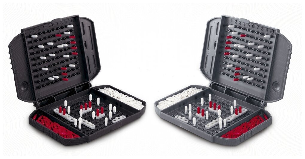 «Морской бой» - настольная логическая игра, изобретенная в конце 18 века, Петром Кондратьевым. С тех пор она стала популярным развлечением во всем мире! Предлагаем вашему вниманию усовершенствованный вариант игры «Морской бой». Это две компактные коробочки, которые удобно брать с собой. Больше не нужно судорожно искать письменные принадлежности и бумагу! Здесь игровое поле - это два чемоданчика, а корабли - фишки-гвоздики (белые и красные).