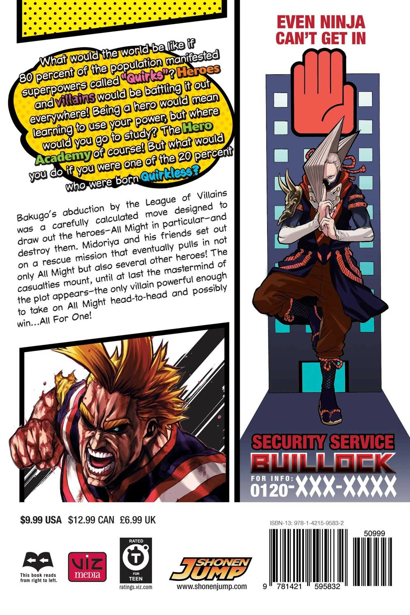 Midoriya inherits the superpower of the world's greatest hero, but greatness won't come easy. What would the world be like if 80 percent of the population manifested superpowers called "Quirks"? Heroes and villains would be battling it out everywhere! Being a hero would mean learning to use your power, but where would you go to study? The Hero Academy of course! But what would you do if you were one of the 20 percent who were born Quirkless? Bakugo's abduction by the League of Villains was a carefully calculated move designed to draw out the Heroes-All Might in particular-and destroy them. Midoriya and his friends set out on a rescue mission that eventually pulls in not only All Might but also several other heroes! The casualties mount, until at last the mastermind of the plot appears-the only villain powerful enough to go head-to-head with All Might and possibly win...All For One! Fun, action-packed story that takes inspiration from American superhero comics.