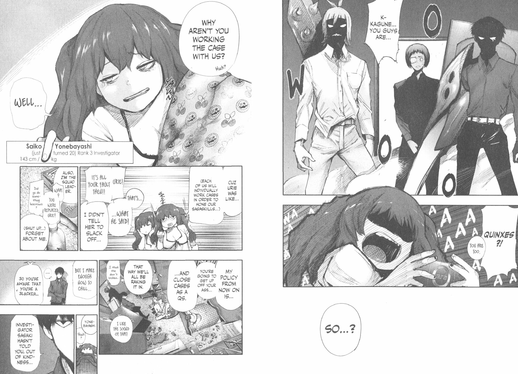 In the world of Tokyo Ghoul, sometimes the only way to fight monsters is to become one... The Commission of Counter Ghoul is the only organization fighting the Ghoul menace, and they will use every tool at their disposal to protect humanity from its ultimate predator. Their newest weapon in this hidden war is an experimental procedure that implants human investigators with a Ghoul's Kagune, giving them Ghoul powers and abilities. But both the procedure and the newly formed Qs Squad are untested. Will they become heroes...or monsters?! Haise Sasaki is in charge of turning the unruly members of the Qs Squad into an elite counter-Ghoul unit. But with everything to prove, will his team bite off more than it can chew when it starts investigating the mysterious organization Aogiri Tree? And can Haise be the mentor the Qs need when his forgotten past could come back to haunt him at any moment? Continuation of the grotesque horror/action story about a reluctant monster that became the definitive smash hit of 2015. * Releases 6 times a year for 8+ volumes. * Volumes 1-12 of Tokyo Ghoul have sold more than 414,000 copies (Bookscan 1/17). * Volumes 1-8 of Tokyo Ghoul have consistently been at the top of both the Bookscan and NYT list since release, often simultaneously. * Tokyo Ghoul anime streams on Netflix in the UK. * Tokyo Ghoul manga review: "...The manga continues to surprise me with its character development and extra backstory that it adds." -Dustin Cabeal, Comic Book Bastards * Tokyo Ghoul manga review: "This is a great series for anyone looking for unrelenting existential dread." -Che Gilson, Otaku USA