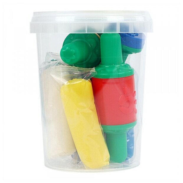 Набор состоит из разноцветного теста для лепки, скалки для раскатывания лепёшек и фигурных штампиков. Всё упаковано в удобный пластмассовый стаканчик.