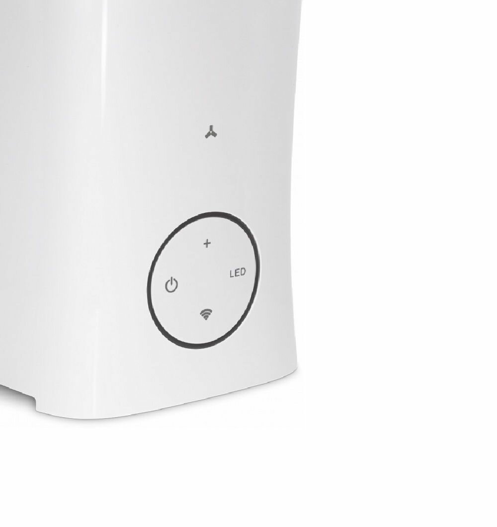 Всего одной кнопкой можно настроить уровень увлажнения воздуха, а цвет светодиодного индикатора (красный, зелёный или синий) подскажет, какой из них выбран. Доступны варианты на 8, 10 или 12,5 часов непрерывной работы с расходом воды от 160 до 250 мл воды в час.