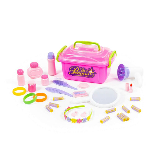 В комплектацию набора входит множество предметов для ухода за внешностью маленькой принцессы и различные аксессуары. Фен с механическим управлением, расчески, бигуди, флакончики духов, бутафорные средства для макияжа, клипсы и многое другое позволит девочке открыть свой игровой салон красоты и наряжаться самой или с подружками. Все предметы компактно умещаются в удобный чемоданчик с ручкой.