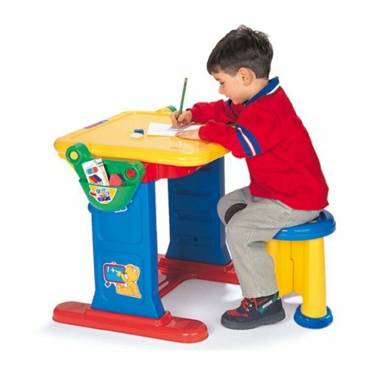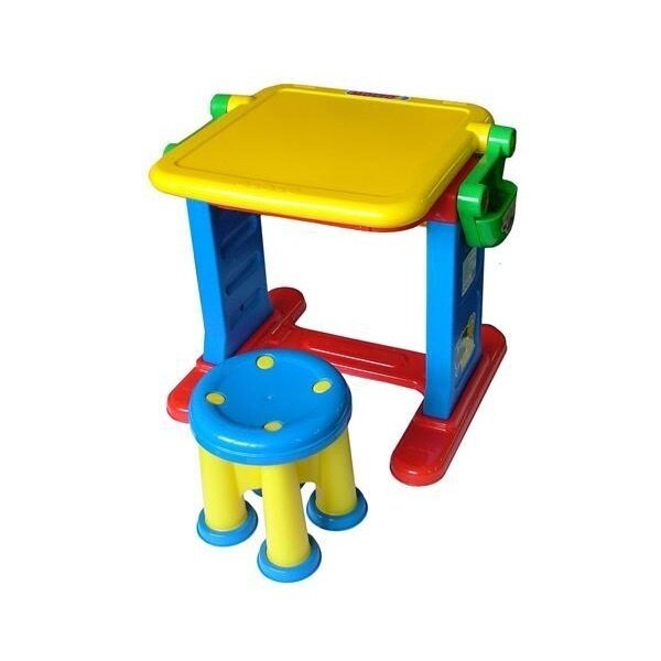 Она сделана из очень качественного и экологически чистого материала. В комплекте есть столик-мольберт и стульчик. Стульчик имеет круглую поверхность. У него четыре ножки. Он очень устойчивый и яркий. У парты две ножки, которые имеют устойчивое, мощное основание. Столешница трансформируется в мольберт. Под столешницей имеется отсек для канцелярии, мела. Стол-мольберт с табуреткой Моя первая студия Полесье (Polesie) складывается. Сборка очень простая и понятная даже без инструкции
