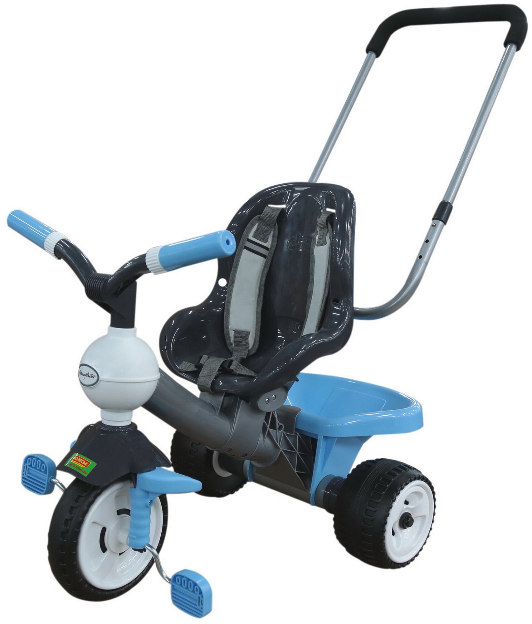Есть багажная корзина для игрушек - пластиковая Материал изготовления велосипеда - металлические элементы, пластмасса, резиновые детали. Родительская ручка регулируется по высоте в трех положениях. Пятиточечный ремень безопасности с мягкими накладками. Колёса задние пластмассовые, передние с резиновой вставкой.