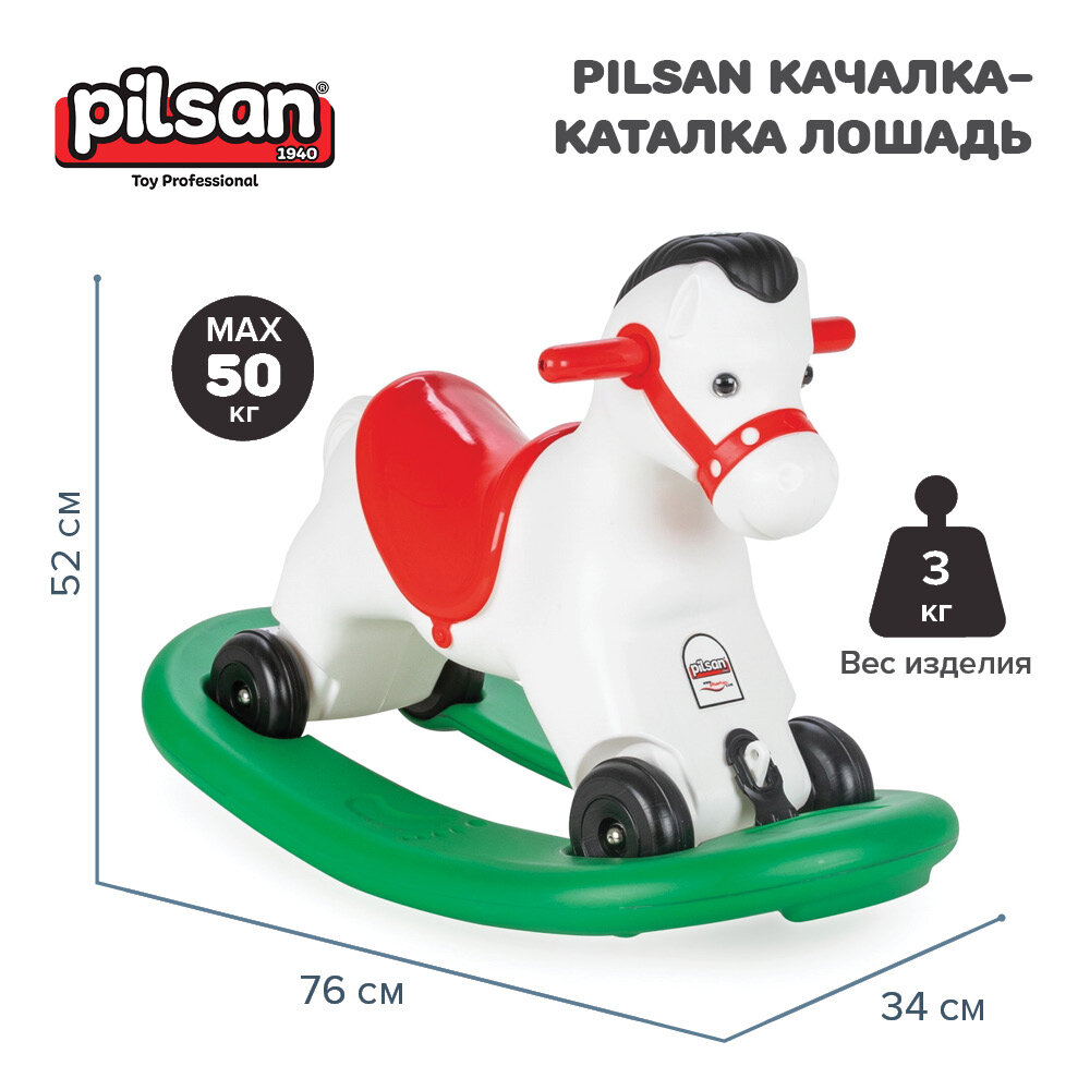 Качалка PILSAN Лошадка (07520) Эта очаровательная лошадка — первая качалка Вашего малыша — стимулирует и развивает вестибулярный аппарат, ловкость и координацию движений. Качалка имеет удобные для маленького ребенка ручки. Рассчитана на максимально безопасный диапазон качания. Качалка развивает вестибулярный аппарат. Сперва игрушку можно использовать, как безопасную качалку, а потом, кататься на ней, убрав платформу. Ее можно использовать как в доме, так и на улице.