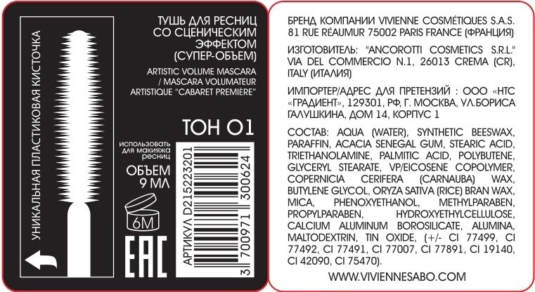 Vivienne Sabo Artistic Volume Mascara Cabaret - Тушь для ресниц со сценическим эффектом супер-объем. В составе туши для ресниц смола сенегальской акации, карнаубский и рисовый воски, не содержит отдушек. Имеет пластиковую щеточку с узким кончиком, упругая и пластичная, она позволяет равномерно распределить тушь по ресницам, разделяет реснички и придает им феноменальный объем. Формула таши обеспечивает ресницам уход и защиту, тушь не осыпается и долго сохраняет идеальный вид.