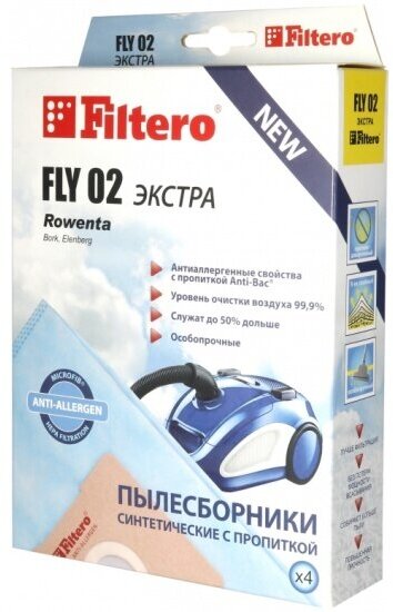 Filtero Fly 02 Экстра произведены из синтетического микроволокна MicroFib, пятислойные. Очень прочные, не боятся острых предметов и влаги, собирают больше (до 50%) пыли, чем бумажные. Обеспечивают уровень очистки воздуха нера. Сохраняют мощность всасывания в течение всего периода службы пылесборника. Антибактериальная пропитка Anti-Bac защищает от аллергенов и угнетает размножение бактерий в мешке. Рекомендуются для семей с детьми, людей страдающих аллергией и заболеваниями дыхательных путей.