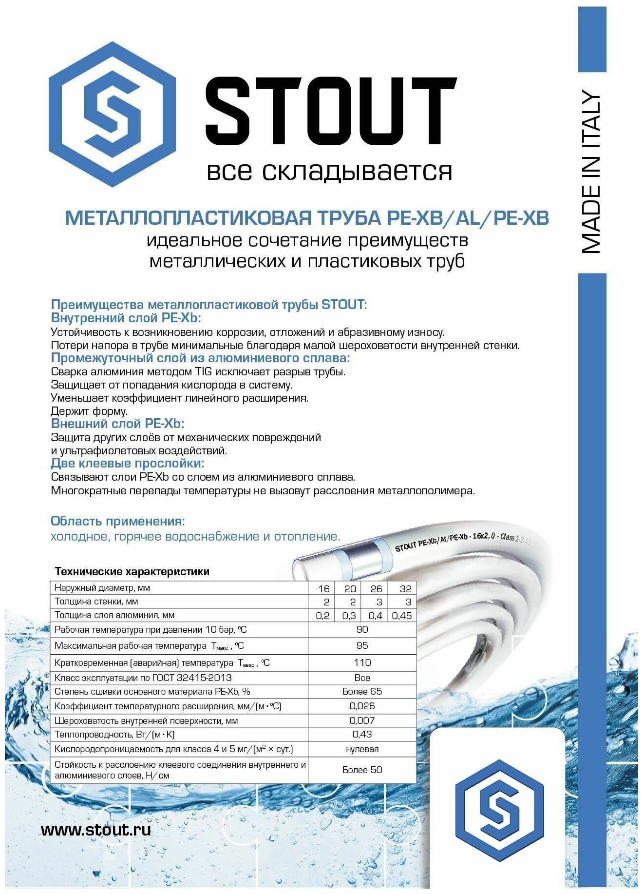 Многослойные трубы Stout - эксклюзивная продукция итальянского производителя, прекрасно показавшая себя в российских условиях эксплуатации. Металлопластиковые трубы Stout предназначены для использования в системах отопления, кондиционирования, холодного, горячего и питьевого водоснабжения. Внутренний и внешний слои выполнены из сетчатого полиэтилена, а промежуточная прослойка из алюминиевого сплава.