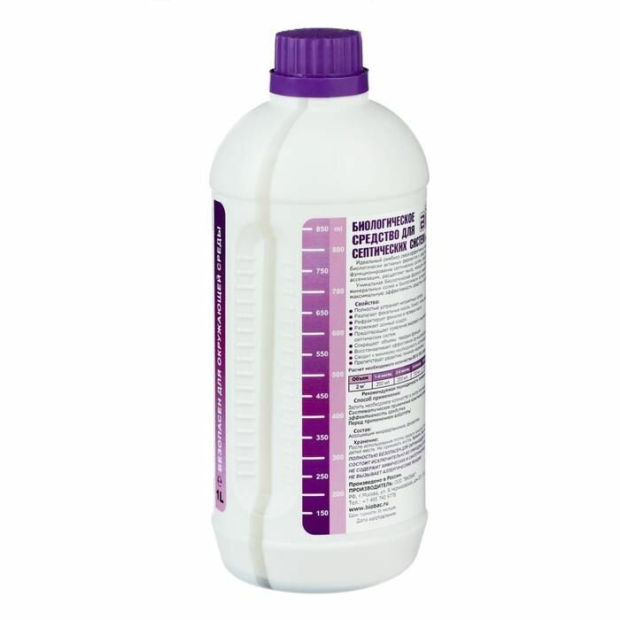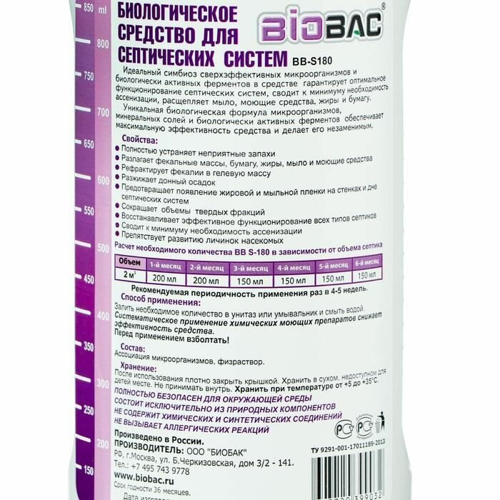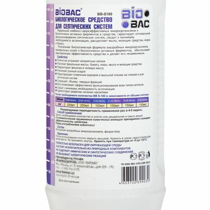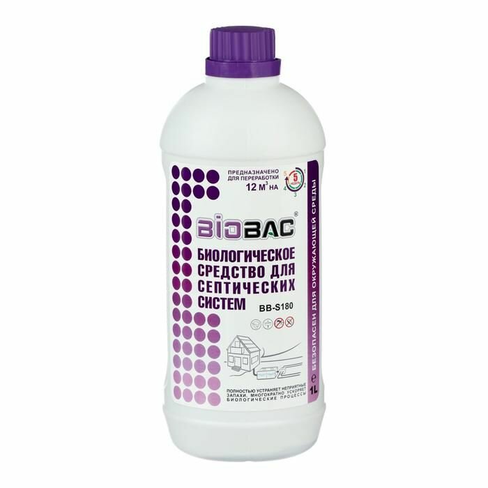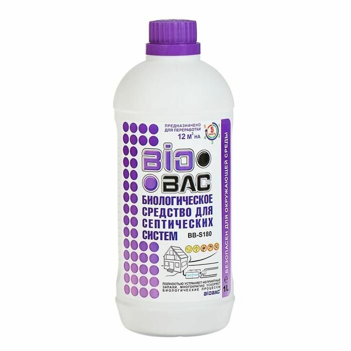 BIOBAC - это уникальное средство, предназначенное для оптимального функционирования септических систем, сведения к минимуму необходимости ассенизации, расщепления мыла и бумаги. Обладая уникальной биологической формулой анаэробных микроорганизмов, обеспечивающих максимальную эффективность средства, оно полностью устраняет неприятные запахи. Объем бутылки составляет: 1 литр