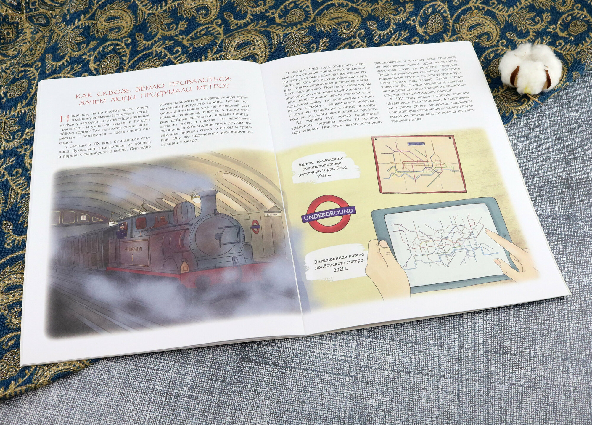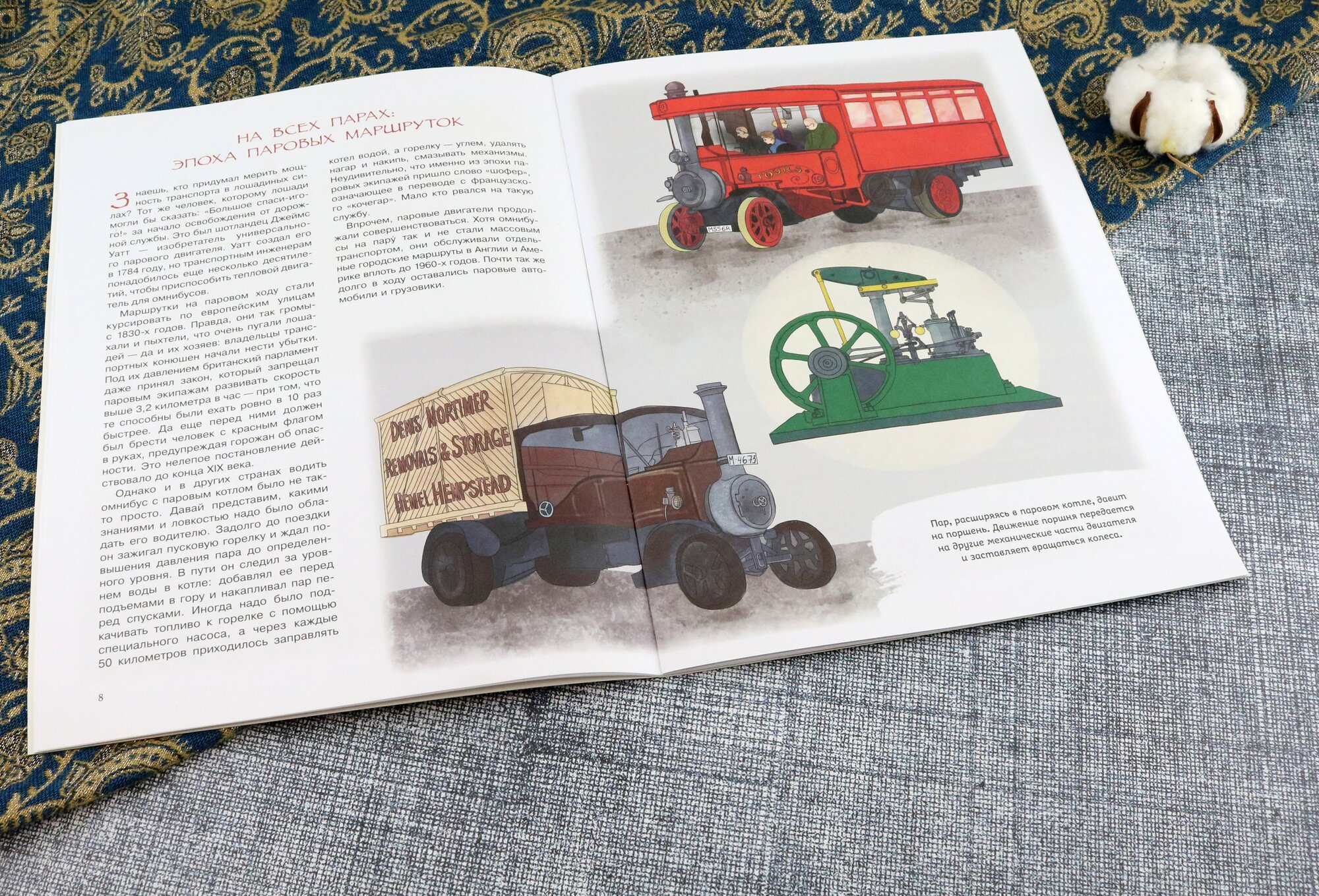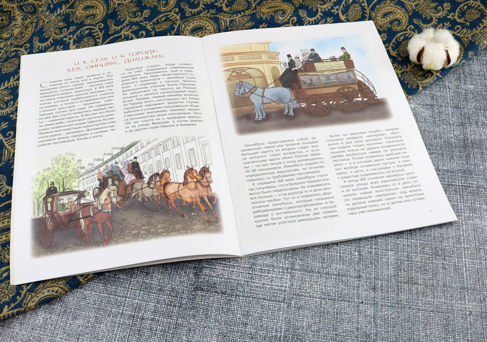 Очень люблю эту серию книг с восковой печатью на обложке. Новинки сразу скупила. Большого формата, обязательно иллюстрированные, с мягкой обложкой, в районе 30-50 страниц. Кажется, что немного, но информация рассматривается всесторонне и при этом не слишком сложно и глубоко, чтобы ребенок не утомился от чтения. Эта книга знакомит нас с «эволюцией» пассажирского транспорта – от ослика до безопасного и экологически чистого транспорта будущего. Отдельно рассматривается общественный транспорт в России. А особенно нам понравился разворот про необычные средства передвижения – уличные эскалаторы, городские фуникулеры, ходули для почтальонов. Очень познавательно + дает повод на улице поиграть и повспоминать, что прочитали в книге.