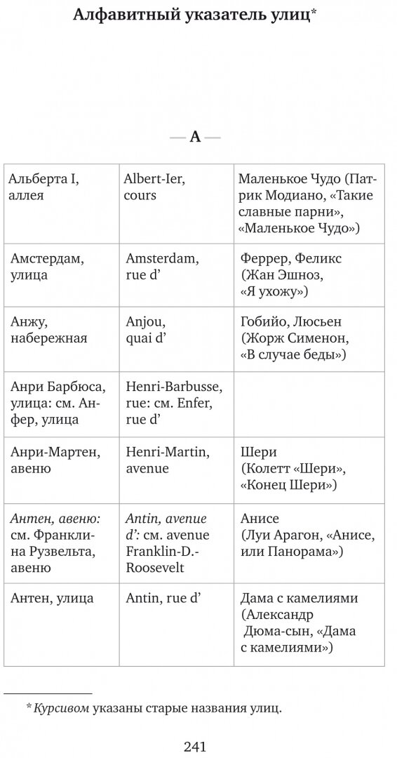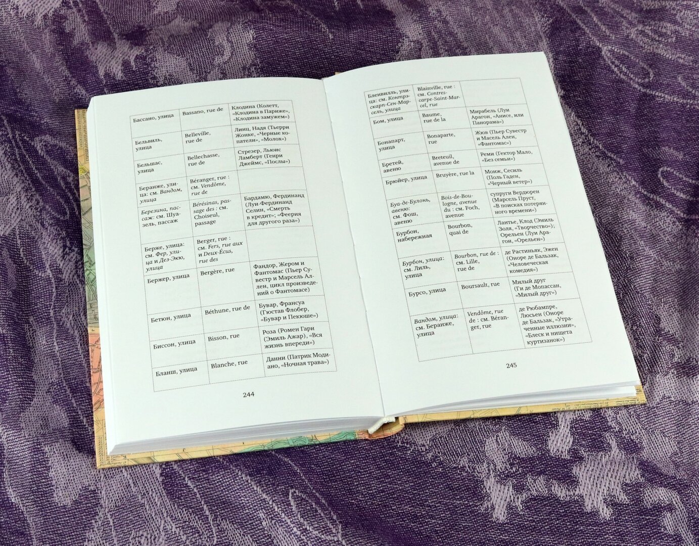 Как настоящий документ, книга снабжена обширным приложением, где герои книг указаны с адресами улиц по округам Парижа. И наоборот, алфавитный указатель улиц с произведениями и героями, где происходит действие книг. Здесь и старые названия улиц, и новое их звучание.