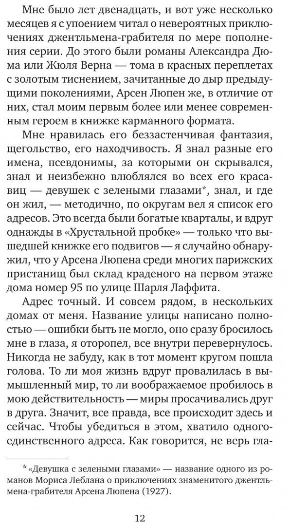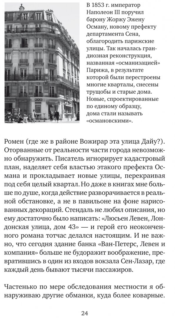 "Я хожу по городу, как по библиотеке, имена героев на разновременных планах города чертят мне карту параллельного мира, населенного призраками. Придет охота - я буду знать, где найти Эдмона Дантеса (Елисейские Поля, дом 30), Жана Вальжана (улица Вооруженного человека, дом 7), Бенжамена Малоссена (улица Фоли-Реньо, 78). Смогу при желании пообедать за одним столиком с Эженом де Растиньяком в "Роше де Канкаль" на улице Монторгёй или заявиться в салон на улице Монталиве и вместе с Шарлем Сванном восхититься диваном "Бове" с узором из виноградных листьев - конечно, если Вердюрены еще не переехали на набережную Конти".