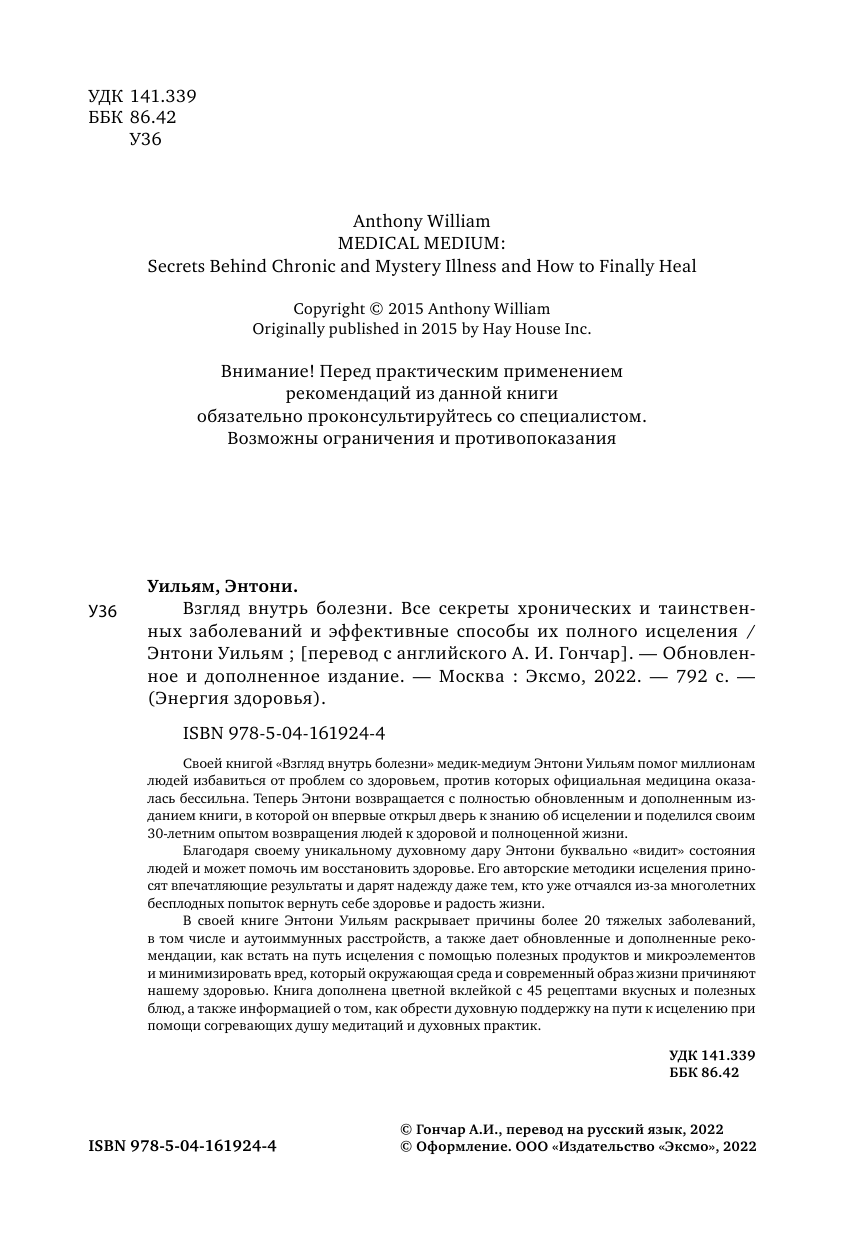 Полностью обновленное и дополненное издание мирового бестселлера «Взгляд внутрь болезни» Энтони Уильяма (продано более 30 000 экземпляров). Энтони Уильям – знаменитый медиум-целитель, автор книг «Еда, меняющая жизнь», «Спасение печени», «Секрет щитовидки», «Сок сельдерея». Уникальный дар автора позволяет ему ставить точные диагнозы и находить причины заболеваний, с которыми не может помочь справиться ни традиционная, ни альтернативная медицина. В своей книге Энтони Уильям раскрывает причины более 20 тяжелых заболеваний, в том числе и аутоиммунных расстройств, а также дает обновленные и дополненные рекомендации, как вернуть здоровье при помощи полезных продуктов и микроэлементов, сбалансированного питания и здорового образа жизни. Цветная вклейка с 45 рецептами оздоравливающих блюд. Диетологическая программа на 28 дней. Исцеляющие медитации и духовные практики. Вдохновляющие истории из целительской практики автора. 104-страничная цветная вклейка с рецептами Более 100 страниц новой информации. Обложка книги украшена лаком.