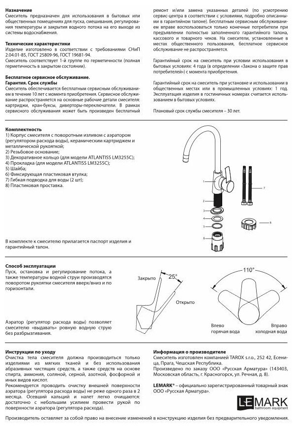 Смесители торговой марки LEMARK производятся в Чехии. Модельный ряд и комплектация изделий разработаны в России с учетом технических и эстетических требований абсолютного большинства как потребителей, так и продавцов данного товара. Перед упаковкой изделия проходят тестовое испытание на специализированных стендах под давлением воды 9 Атм на функциональность рабочих элементов и на герметичность в закрытом состоянии.