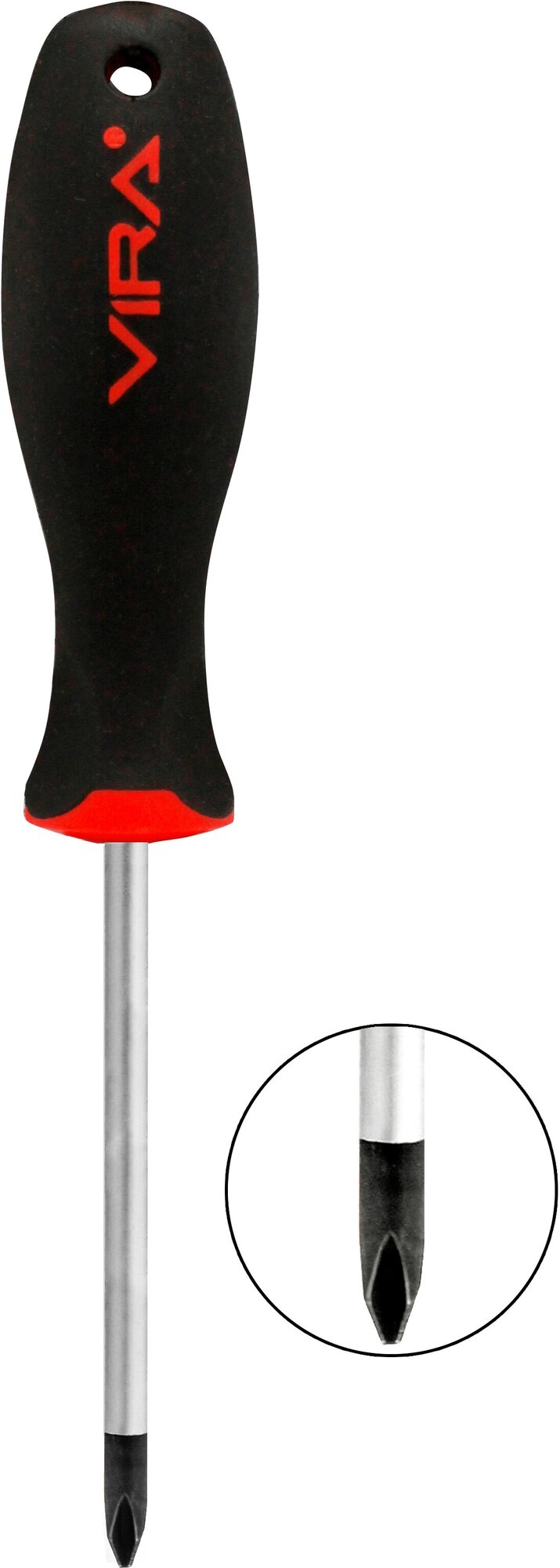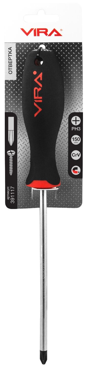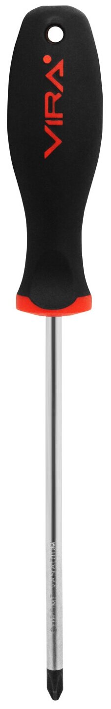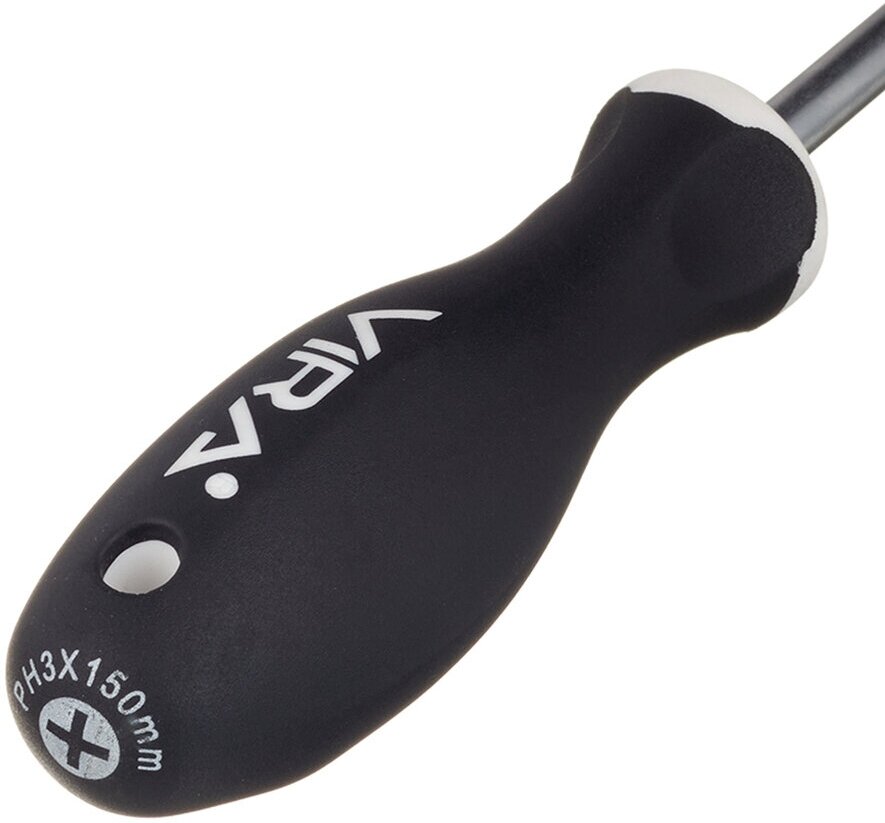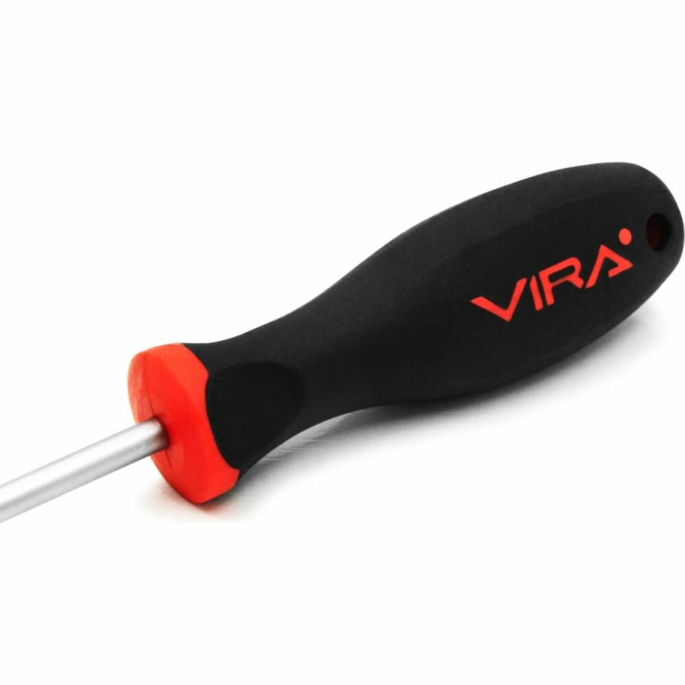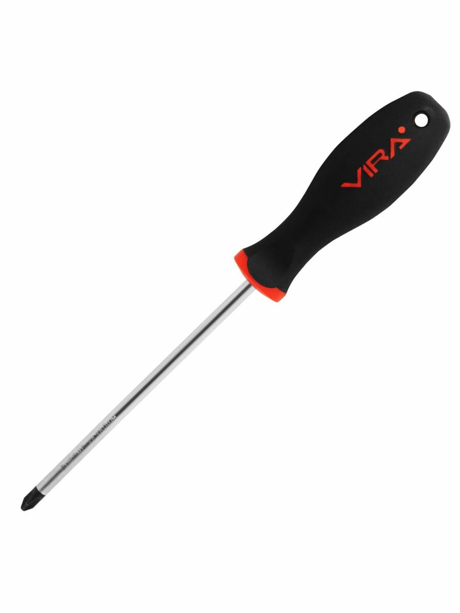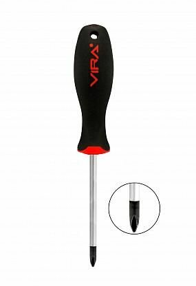 Отвертка VIRA Drive PH3x150. Набор отверток Drive изготовлен из хром-ванадия. Твердость 48-52 HRC. Отвертка в два раза превосходит международный стандарт DIN по показателю предельного крутящего момента. Все отвертки серии имеют магнитный наконечник – мелкий крепеж, детали будет удобнее вворачивать или извлекать, сложнее потерять. Мы привели геометрию жала отвертки в соответствие с промышленным стандартом – оно без люфта помещается в шлице крепежа, благодаря точной обработке углов наконечника. Работая нашей отверткой, Вы не только сбережете шлиц шурупа, но и надолго сохраните сам инструмент, снизите усилия на вращение. Отверстие в рукоятке можно использовать для подвешивания отвертки на стенде, а можно вставить в него вороток для дополнительного усиления крутящего момента. Мы называем рукоятку отвертки VIRA анатомической, потому что она имеет сглаженную трехгранную форму, которая удобно обхватывается рукой, а большой палец естественным образом вкладывается в одно из углублений. Все перечисленные особенности ручки дают возможность создавать больший крутящий момент при меньших усилиях с вашей стороны. Рукоятки отверток выполнены из прочного пластика и упругой резины TPR. Такое сочетание материалов делает ручку крепкой, но мягкой для вашей ладони. Никаких царапающих швов и резких граней. Резиновое покрытие обладает антискользящим эффектом. Размер шлица: PH3, длина стержня 150 мм. Короткий стержень полезен для работы в маленьких пространствах, внутри механизмов.