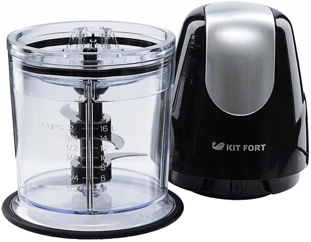 Измельчитель Kitfort быстро измельчает мясо, твердый сыр, овощи, травы, чеснок и многое другое. Двойной нож измельчает продукты по всей высоте емкости. В комплекте идут две емкости: чаша и стакан. Емкости можно закрыть крышками и использовать для хранения продуктов.