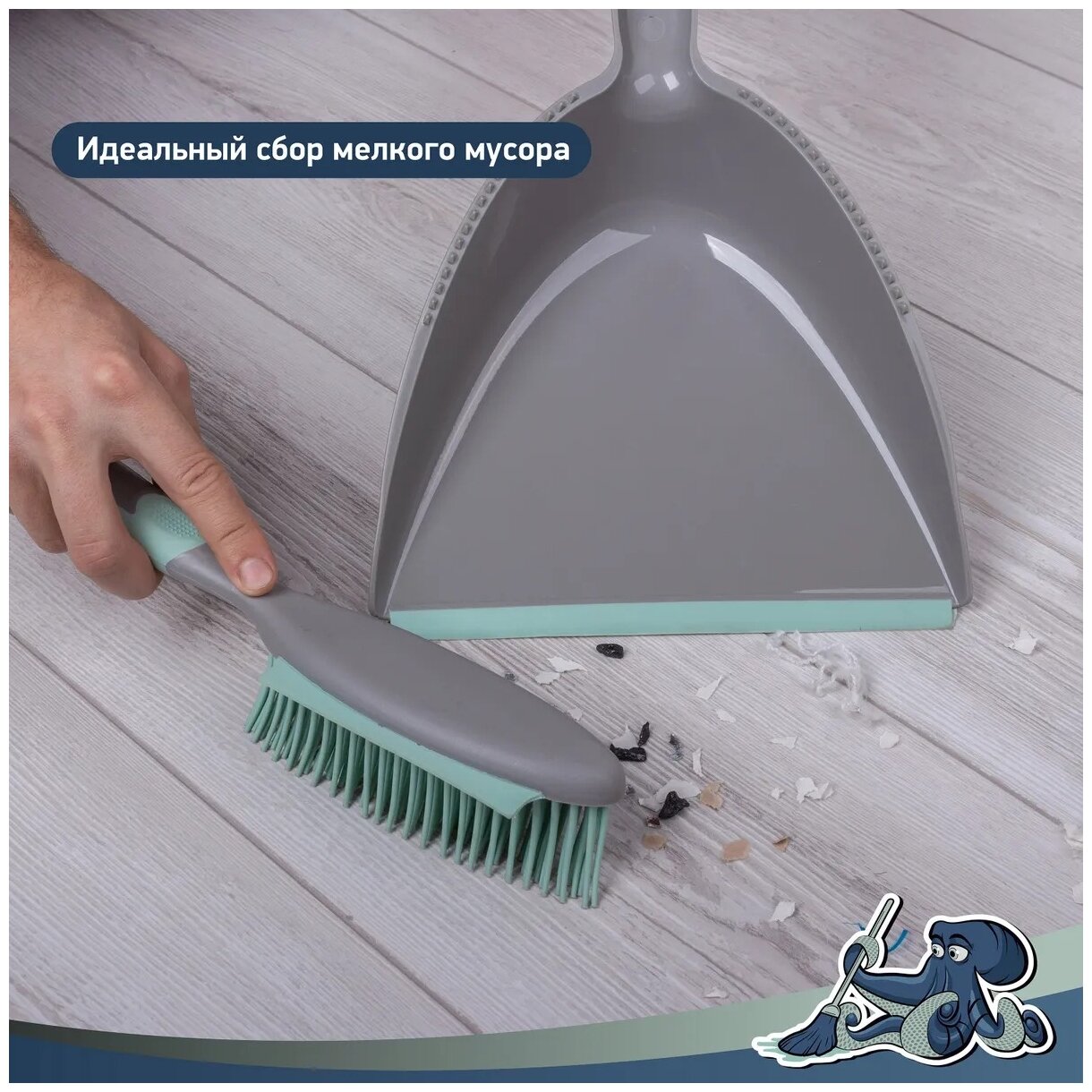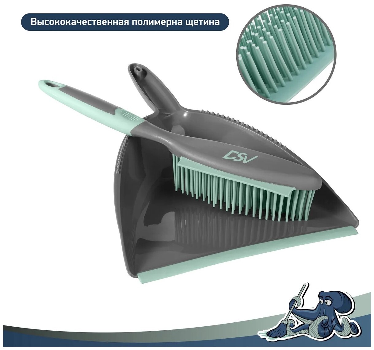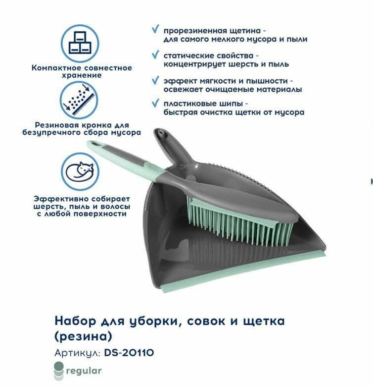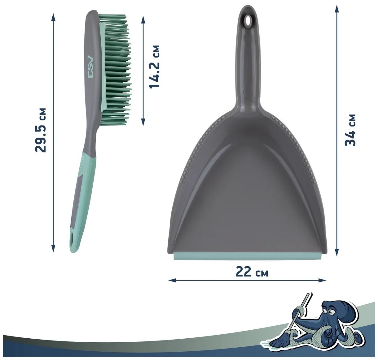 Набор Совок + Сметка с ручкой с прорезиненной щетиной DSV, предназначена для уборки помещений. Изготовлена из современных материалов. Прорезиненная щетина позволяет убирать самые мелкие частички грязи и пыли. Щетка эффективно собирает шерсть, пыль, волосы с любой поверхности, в том числе с мягкой мебели, щетка приподнимает волоски материала, что освежает, придает эффект мягкости и пышности очищаемого материала. Щетка обладает статическими свойствами, поэтому при подметании шерсть домашних животных и пыль собираются контролируемым образом и скручиваются, а не летают по дому, идеальна для сухой уборки помещений, в которых находятся аллергики. Резиновый шпатель на щетке позволяет быстрее собрать мусор. Совок оснащен пластиковыми шипами для очистки щетки от мусора.