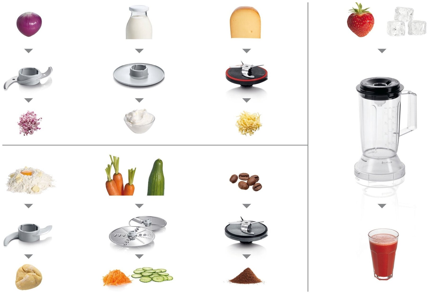 Многофункциональность: терка, шинковка, помол, измельчаение, смешивание и многое другое - благодаря разнообразным насадкам.