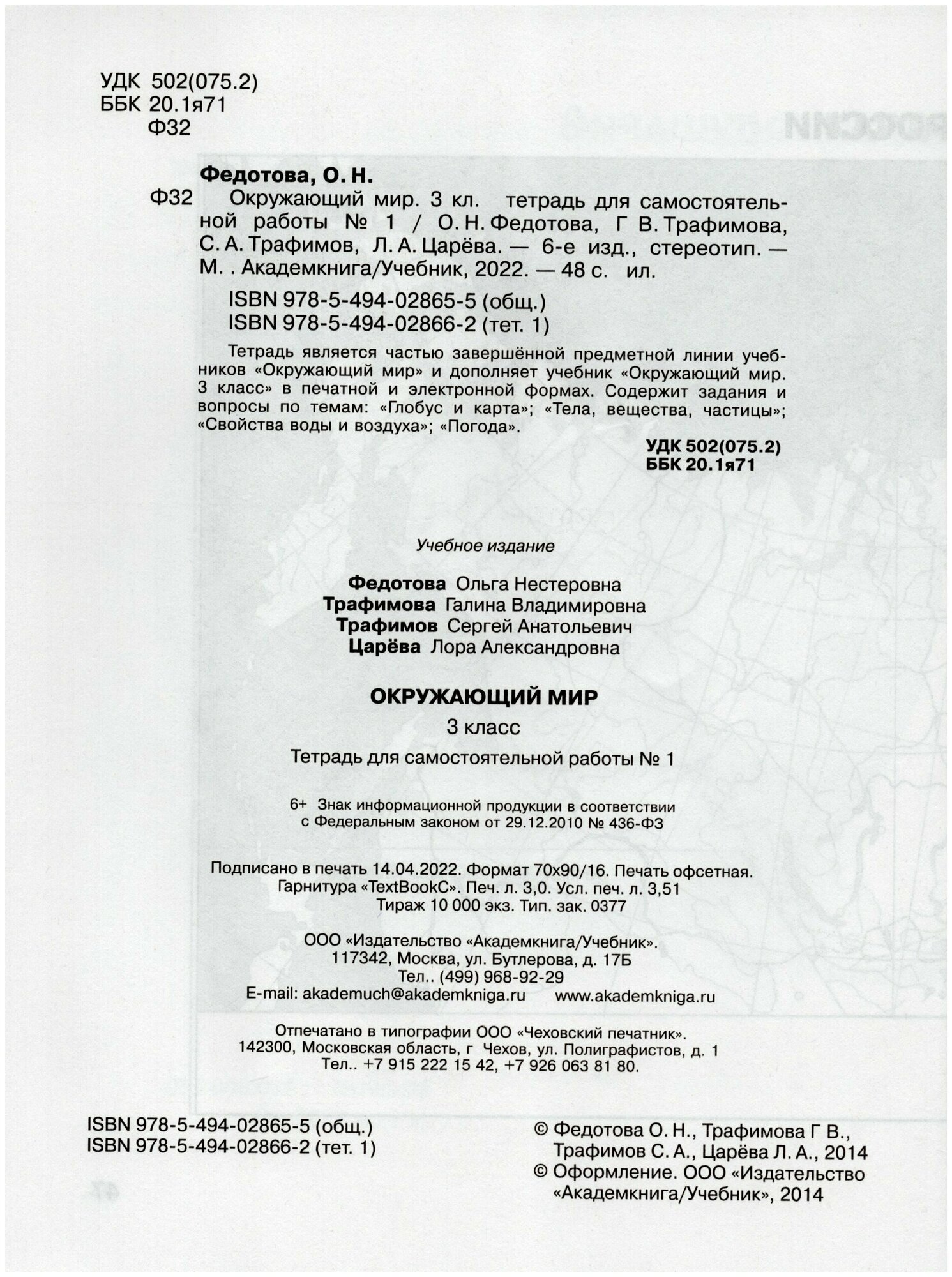 Окружающий мир 3 класс Тетрадь для самостоятельной работы 1 (Федотова Ольга Нестеровна, Трафимов Сергей Анатольевич, Трафимова Галина Владимировна, Царева Лариса Анатольевна); Академкнига/Учебник, 2022