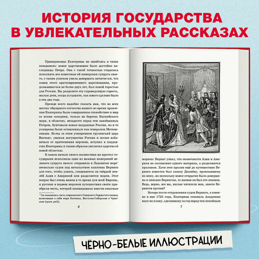 Из этой книги вы узнаете о периоде с начала правления Екатерины I до конца правления Александра I. А о событиях с момента становления древнерусского государства и до конца царствования Петра I можно прочитать в книге «История России в рассказах для детей. От древних славян до Петра I», ISBN 978-5-04-167944-6. Текст публикуется без сокращения. С чёрно-белыми иллюстрациями.