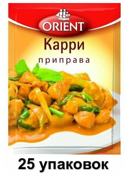 Orient Карри смесь традиционных индийских специй для холодных и горячих блюд. Изысканная остро-сладкая приправа придает блюдам экзотический вкус и насыщенный цвет. Добавляйте в мясные блюда, блюда из птицы, свинины, говядины, баранины, овощей, риса и яиц. В комплекте 25 шт.