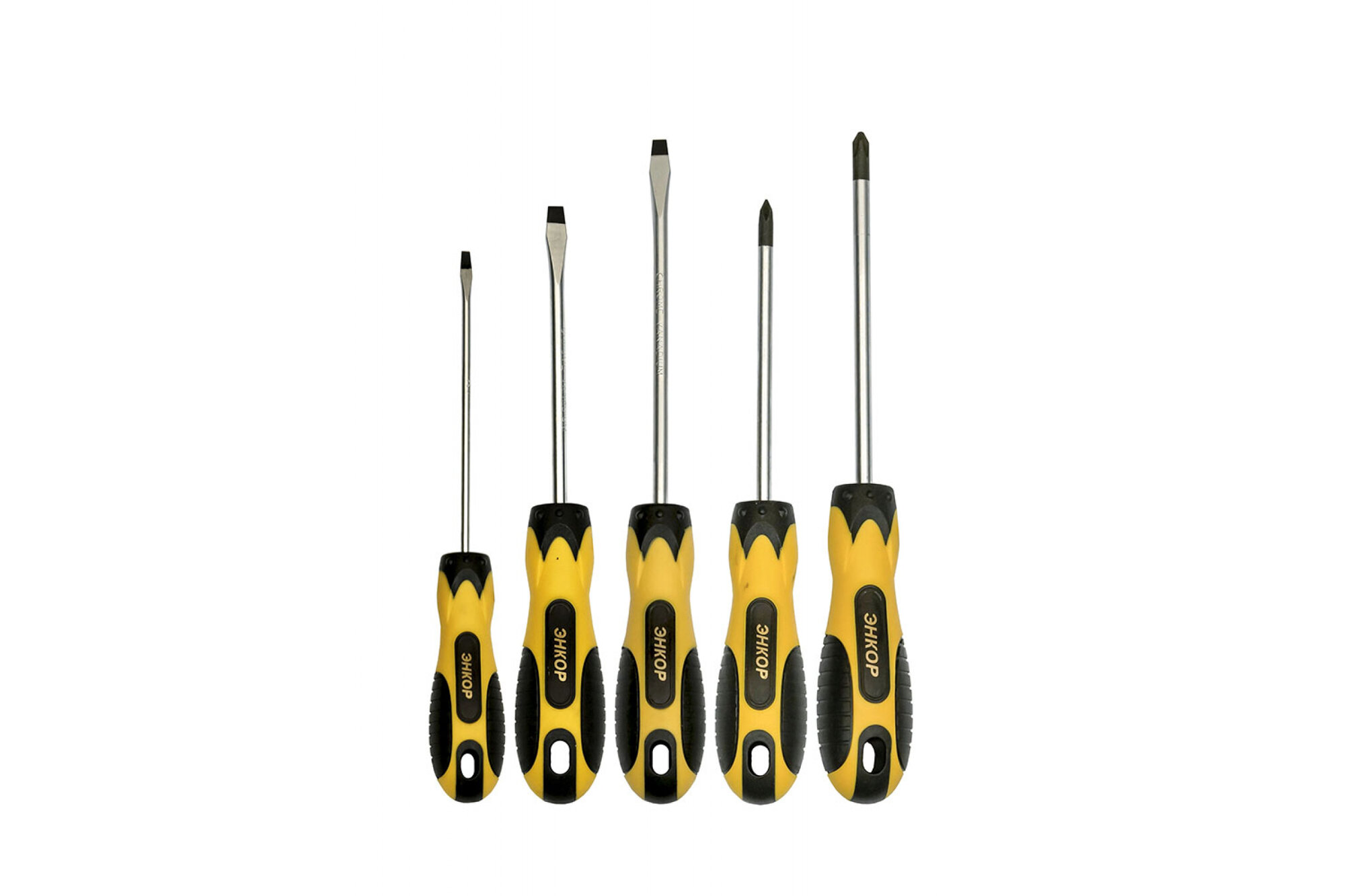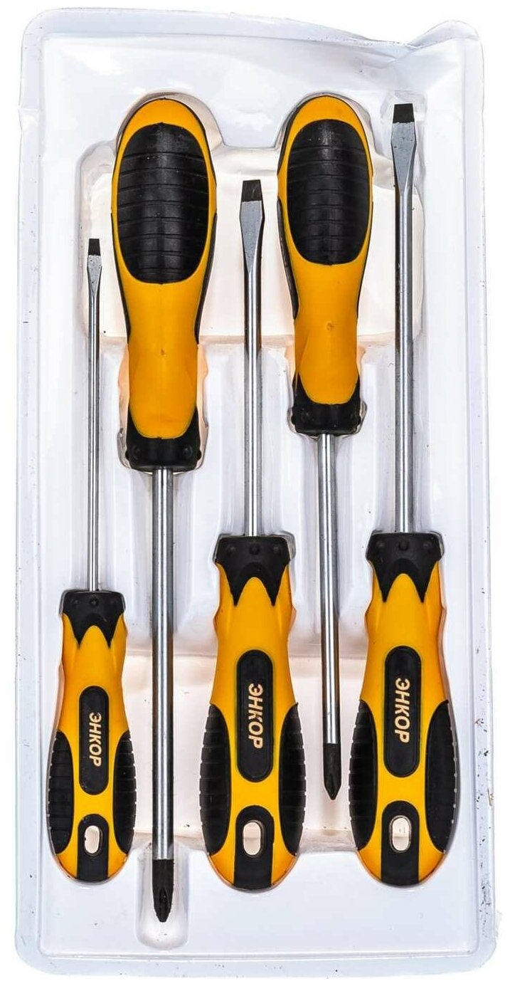 Набор отверток Энкор , 5шт. предназначен для бытового и профессионального применения. Инструменты предназначены для монтажных и демонтажных работ. Преимущества Отвертки изготовлены из материалов высокого качества Устойчивы к влажности и коррозии Оснащены двухкомпонентными рукоятками Отличаются надежным исполнением Имеют длительный срок эксплуатации