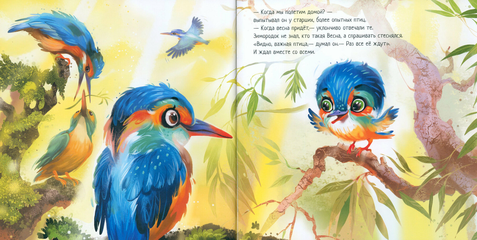 Маленький зимородок не знал, кто такая Весна, но очень ждал, когда она придёт. Ведь только с приходом Весны он сможет полететь домой. И малыш решил сам найти и поторопить Весну. Где он только её не искал: и в небе, и в озере, и на горе,- но нигде не находил. Однако Весна всегда приходит к тому, кто её ищет.