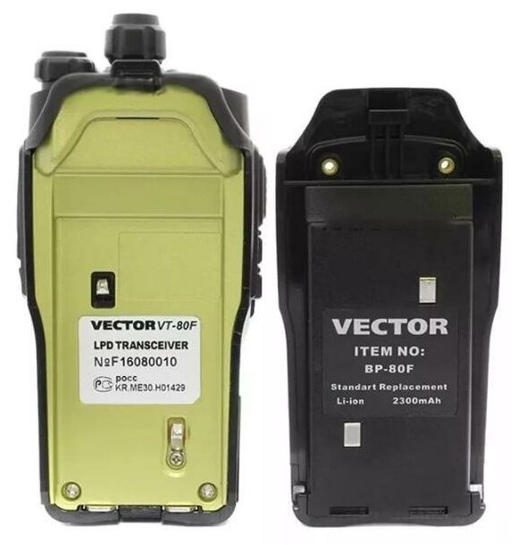 Портативная рация Vector VT-80F снабжена антимагнитным динамиком, который не позволит собираться металлической пыли на корпусе. Она выполнена из прочного поликарбонатного композита на алюминиевой базе и разрабатывалась специально для использования в силовых и охранных ведомствах, где механическая прочность изделия особенно важна. Рация работает на безлицензионных LPD и PMR каналах с возможностью программирования любых частот в диапазоне 400-520 МГц.