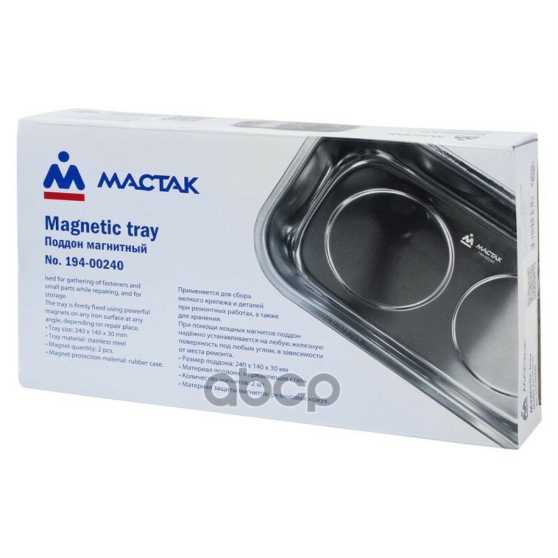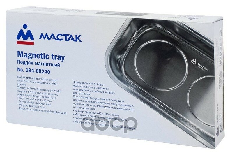Назначение Применяется для сбора мелкого крепежа и деталей при ремонтных работах, а также для хранения. Описание При помощи мощных магнитов поддон надёжно устанавливается на любую железную поверхность под любым углом, в зависимости от места ремонта. • Размер поддона: 240 х 140 х 30 мм • Материал поддона: нержавеющая сталь • Количество магнитов: 2 шт • Материал защиты магнитов: резиновый кожух мастак – ты знаешь как!