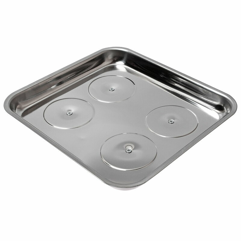 Особенности • Размер поддона: 294 х 273 х 30 мм • Материал поддона: нержавеющая сталь • Количество магнитов: 4 шт • Материал защиты магнитов: резиновый кожух Применяется для сбора мелкого крепежа и деталей при ремонтных работах, а также для хранения. При помощи 4-х мощных магнитов поддон надёжно устанавливается на любую железную поверхность под любым углом, в зависимости от места ремонта. мастак – ты знаешь как!
