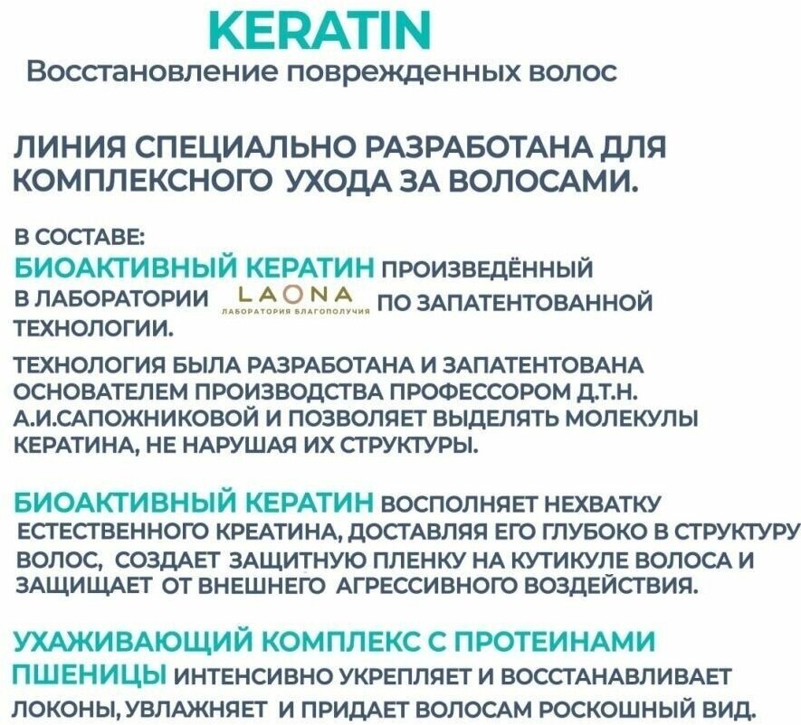 Разработан специально для комплексного ухода. Биоактивный кератин в составе восстанавливает и восполняет нехватку естественного кератина, доставляя его глубоко в структуру волос, создает защитную пленку на кутикуле волоса и защищает от внешнего агрессивного воздействия среды. Ухаживающий комплекс с протеинами пшеницы направлен на интенсивное укрепление и восстановление, увлажняет и придает волосам роскошный ухоженный вид. Профессиональный салонный уход за волосами в домашних условиях.