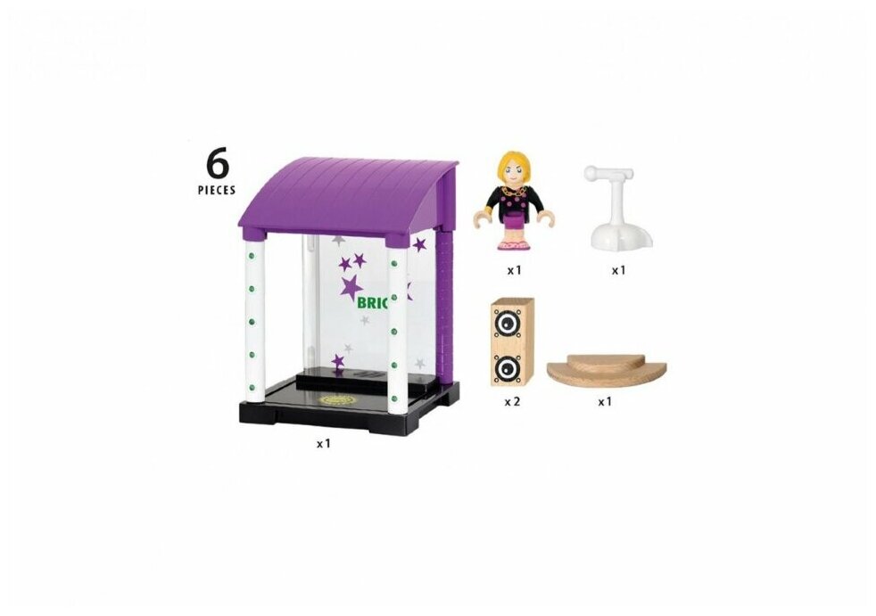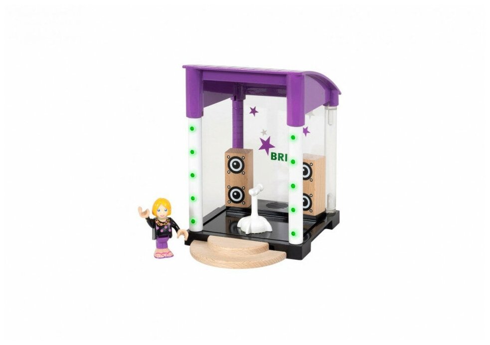Ваш ребенок любит петь? Его друзья – человечки BRIO – тоже обожают музыку! С набором «Караоке-клуб» они могут все вместе исполнить любимые хиты. В состав набора входит один человечек, сцена с навесом и ступеньки, ведущие к ней, микрофон и два больших динамика. Установите микрофон на пол, и заиграет музыка, а сцена осветится яркими огнями! Почувствуй себя настоящей звездой эстрады вместе с BRIO! Элементы изготовлены из гипоаллергенных и полностью безопасных для здоровья детей материалов.